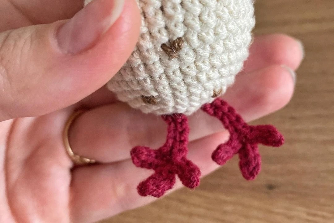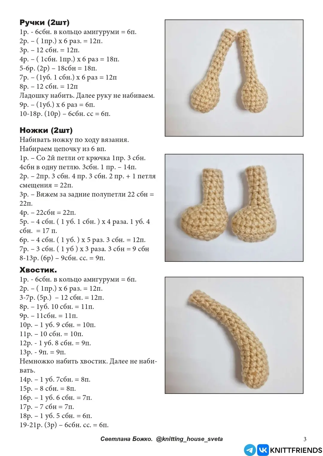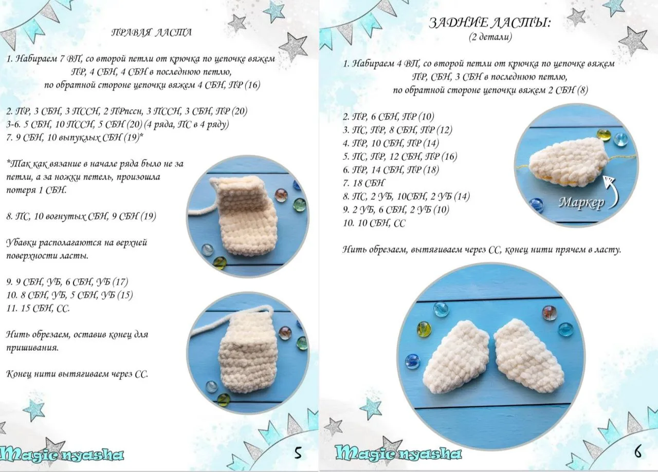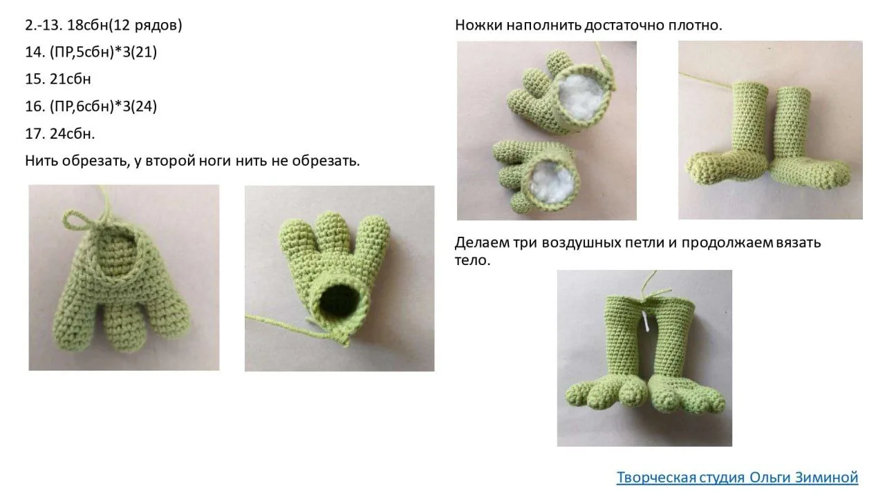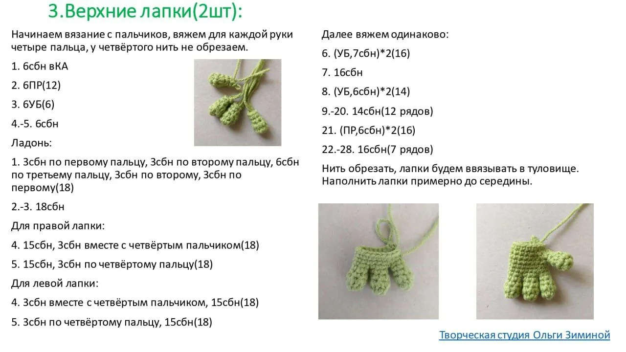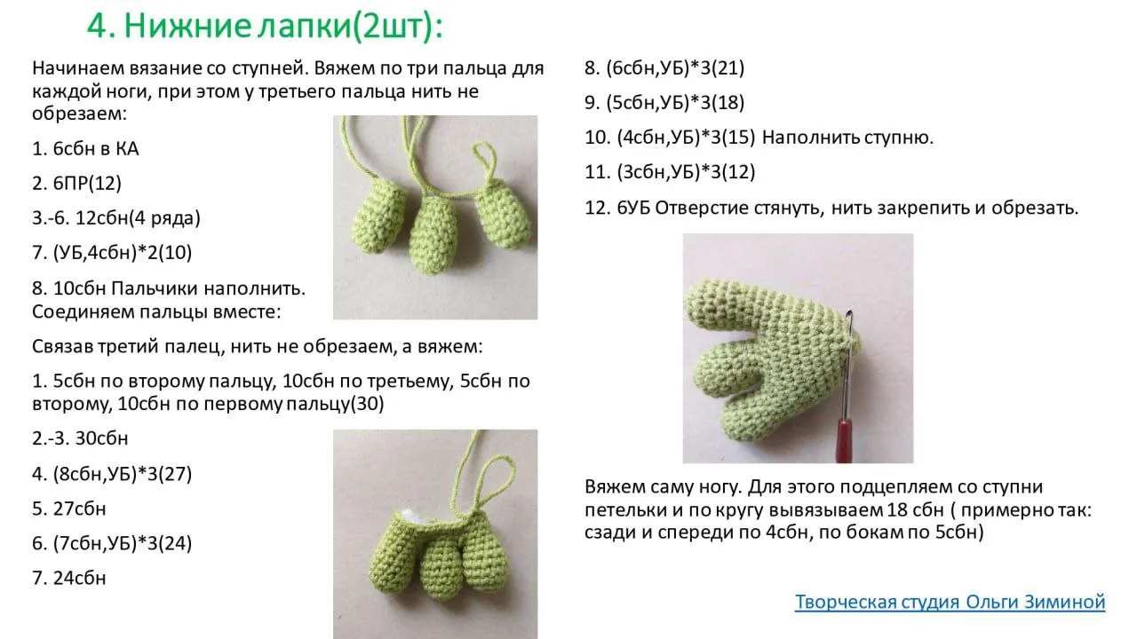 Набираем цепочку из 9 вп, со второй петли вяжем: 3 сс, 4вп, 3сс, 4вп, 3сс, 5 сс по основной цепочке. Вторую лапку вяжем аналогично. Пришиваем так, как показано на фото!