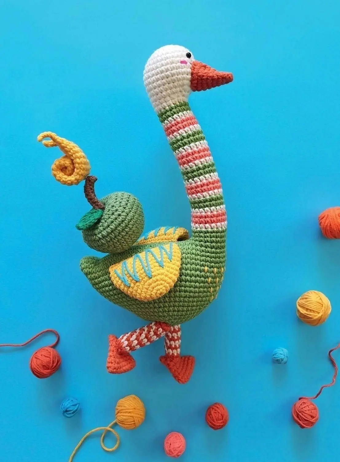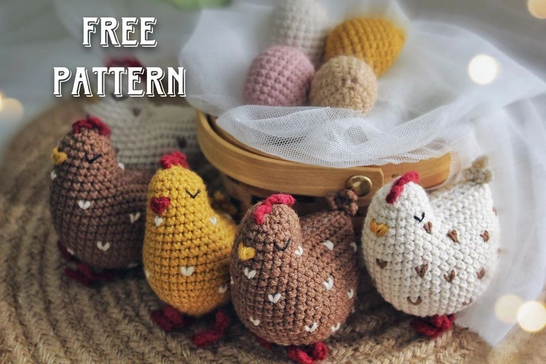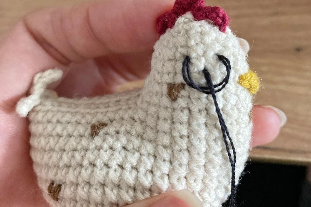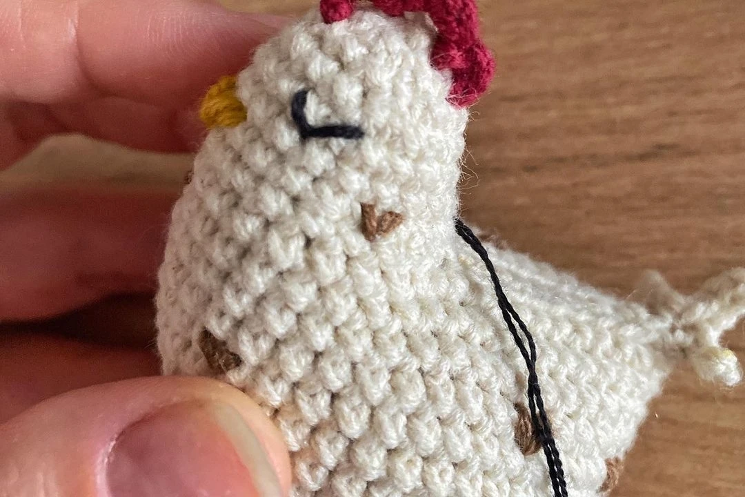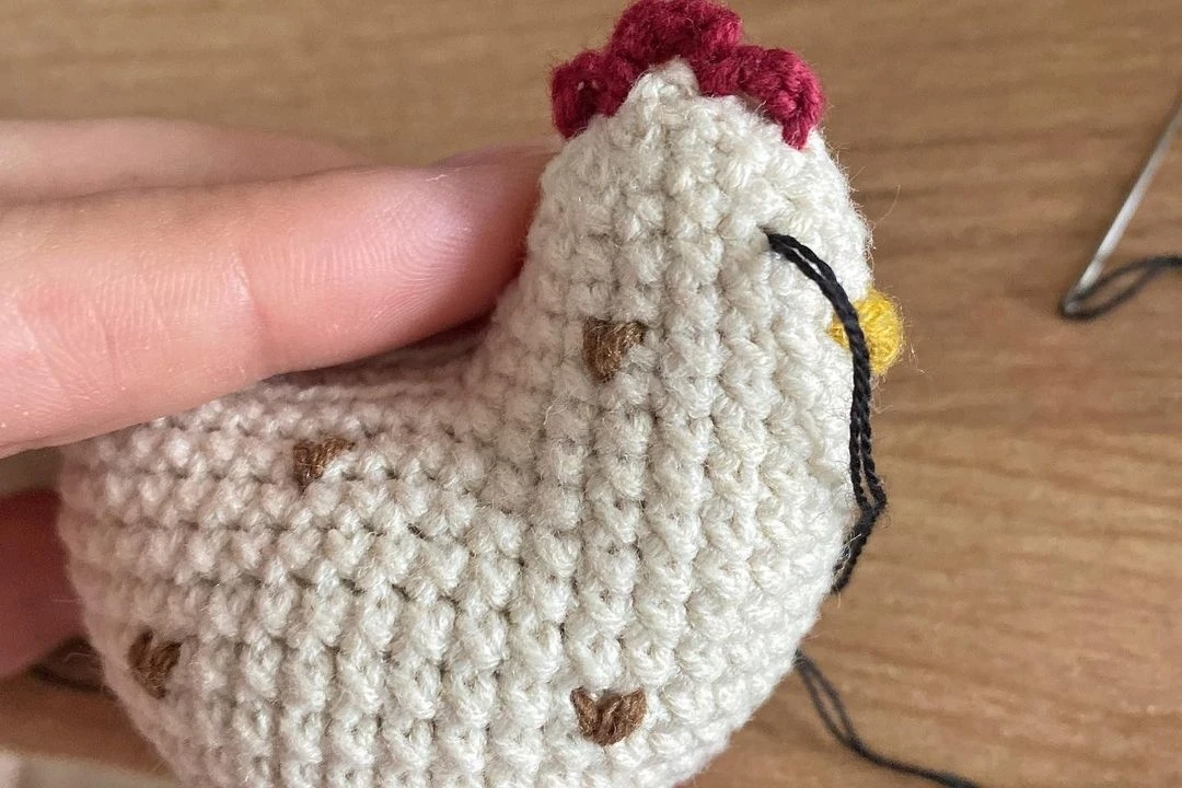 Пряжей контрастного цвета вышиваем галочки по телу курочки в хаотичном порядке.