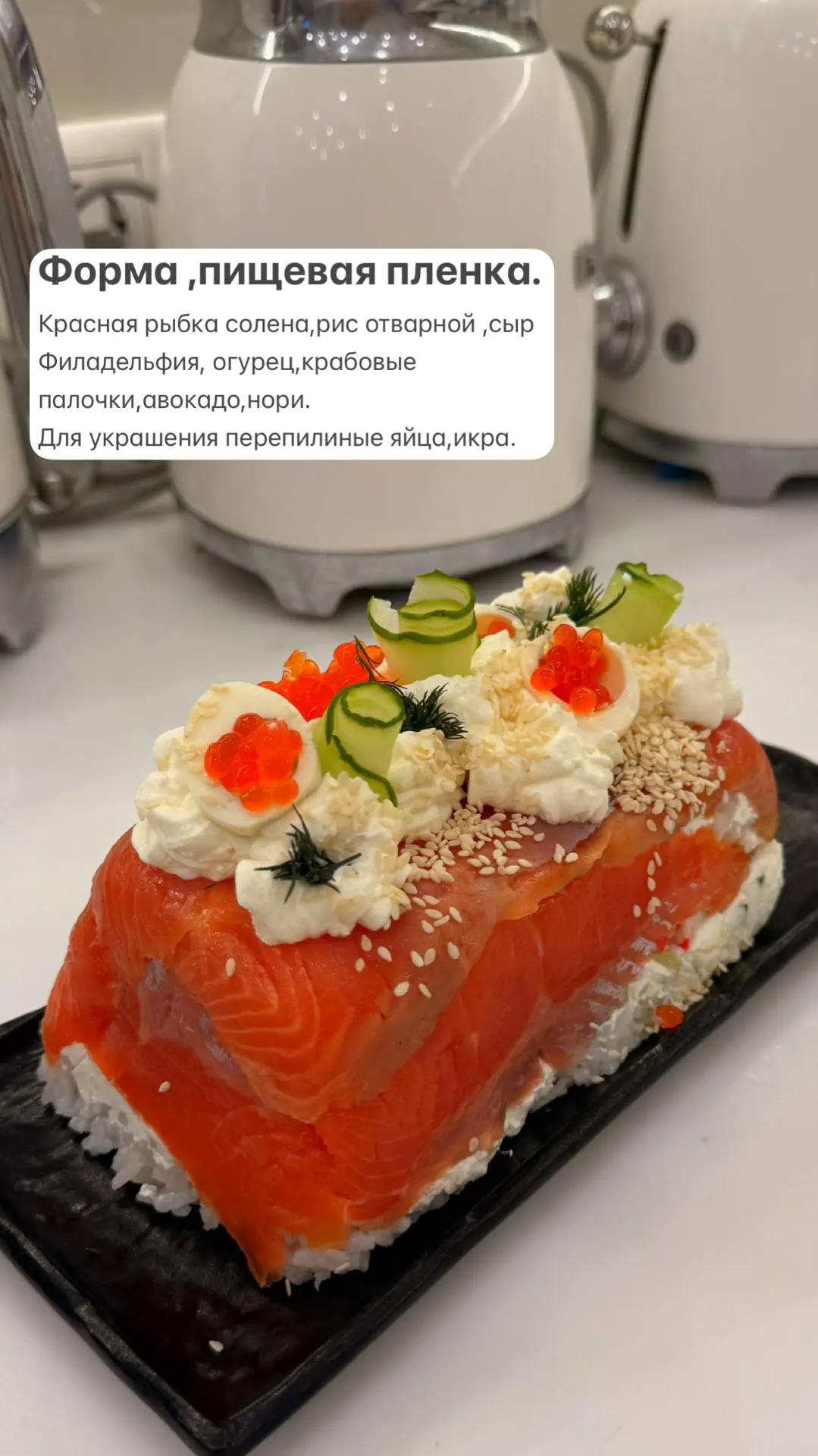 Основа - форма и пищевая плёнка, чтобы держать аккуратную форму 🫙 Дальше всё по классике вкуса: солёная красная рыбка 🐟, мягкий рис 🍚, сливочный сыр «Филадельфия» 🧀. Добавляем хруст огурца 🥒, немного крабовых палочек 🦀, кремовый авокадо 🥑 и лист нори для того самого роллового акцента.