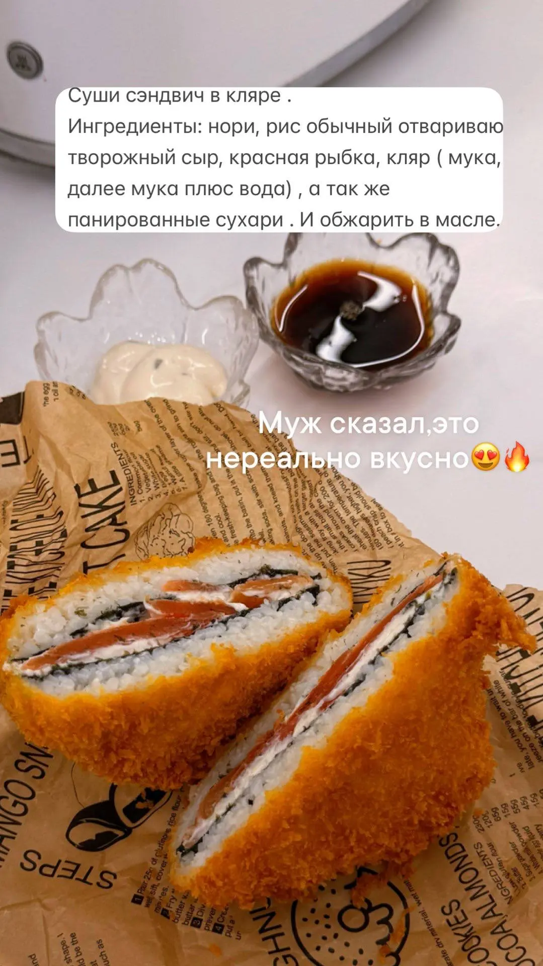Ингредиенты: нори, рис обычный отвариваю, творожный сыр, красная рыбка, кляр (мука далее мука плюс вода) и панировочные сухари.