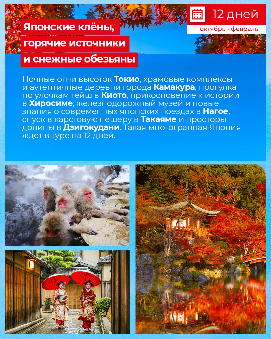 Увидеть Японию в период момидзи, когда клены преображаются в ярко-красные тона, можно с нашими новыми экскурсионными турами. Токио, Киото, Хиросима, Дзигокудани, Никко и другие города раскроют всю многогранность направления.