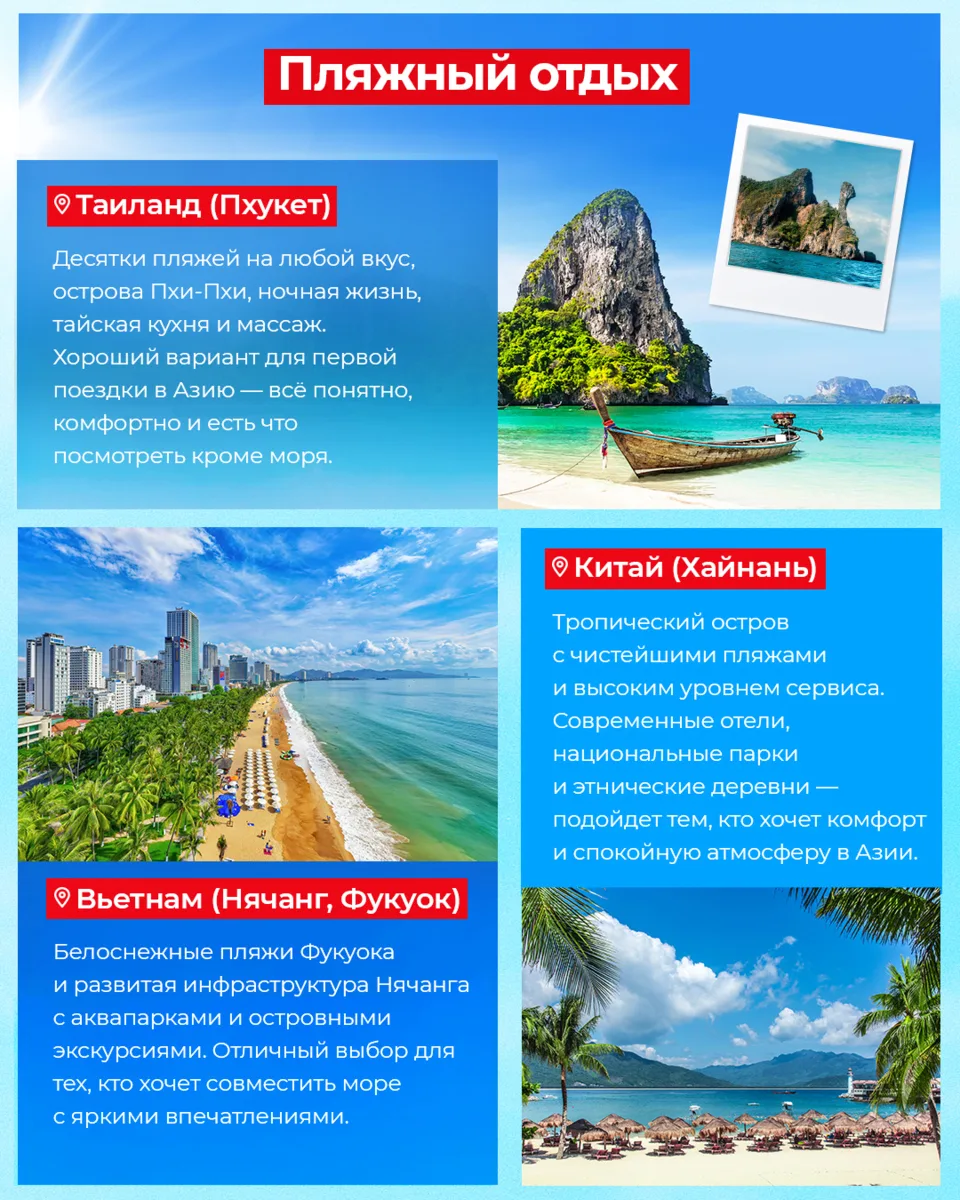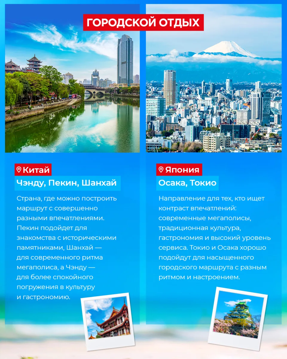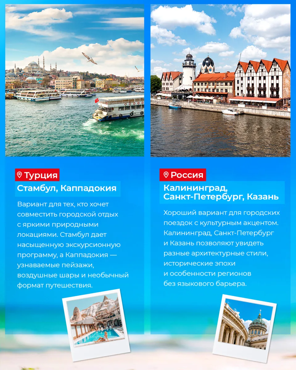 Собрали для вас варианты как пляжного, так и городского отдыха по разным направлениям!