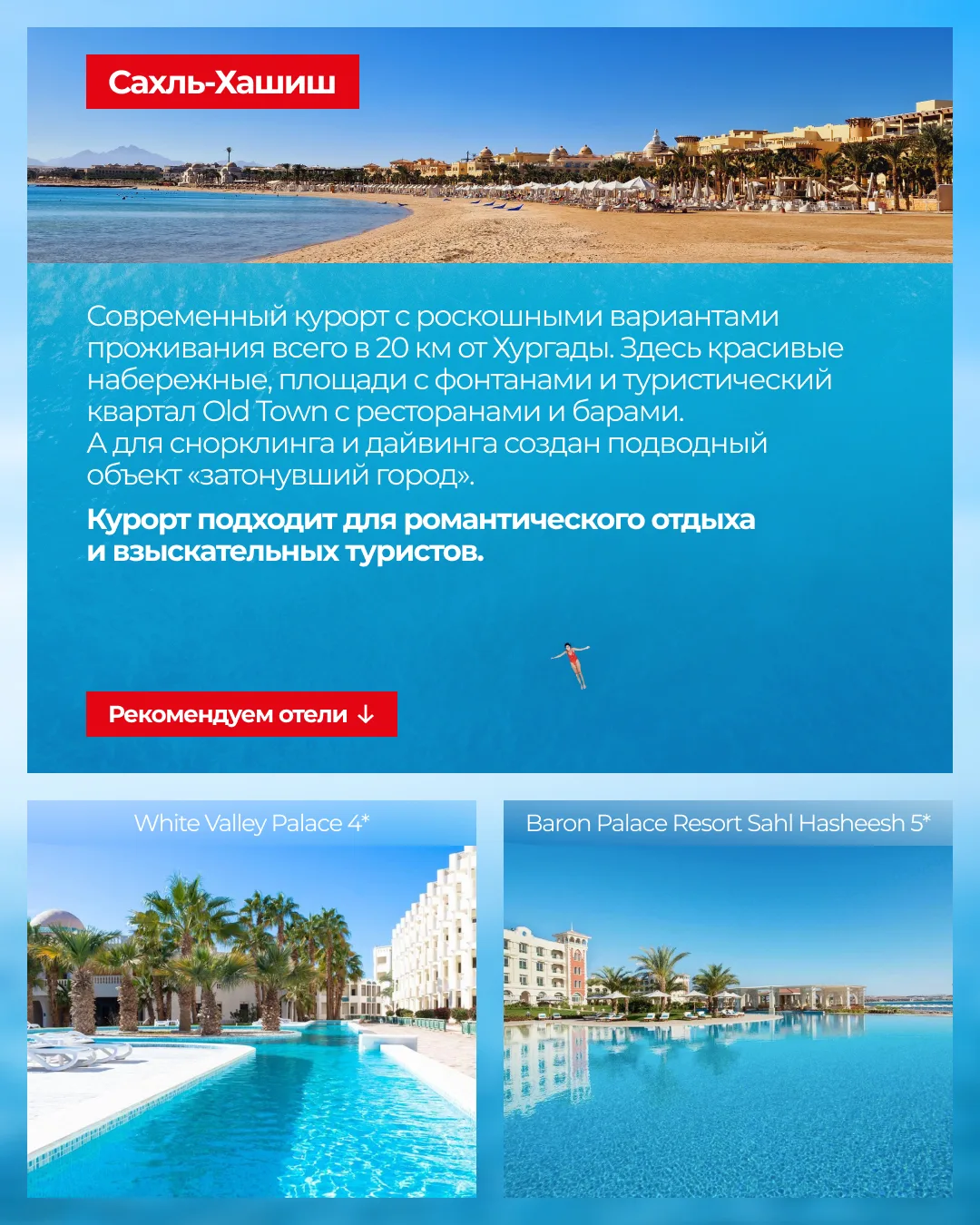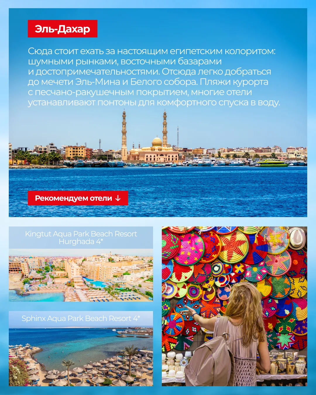 Выбирай курорт, который очарует тебя больше всего. Может, это колоритный Эль-Дахар, а может, роскошный Сахль-Хашиш?