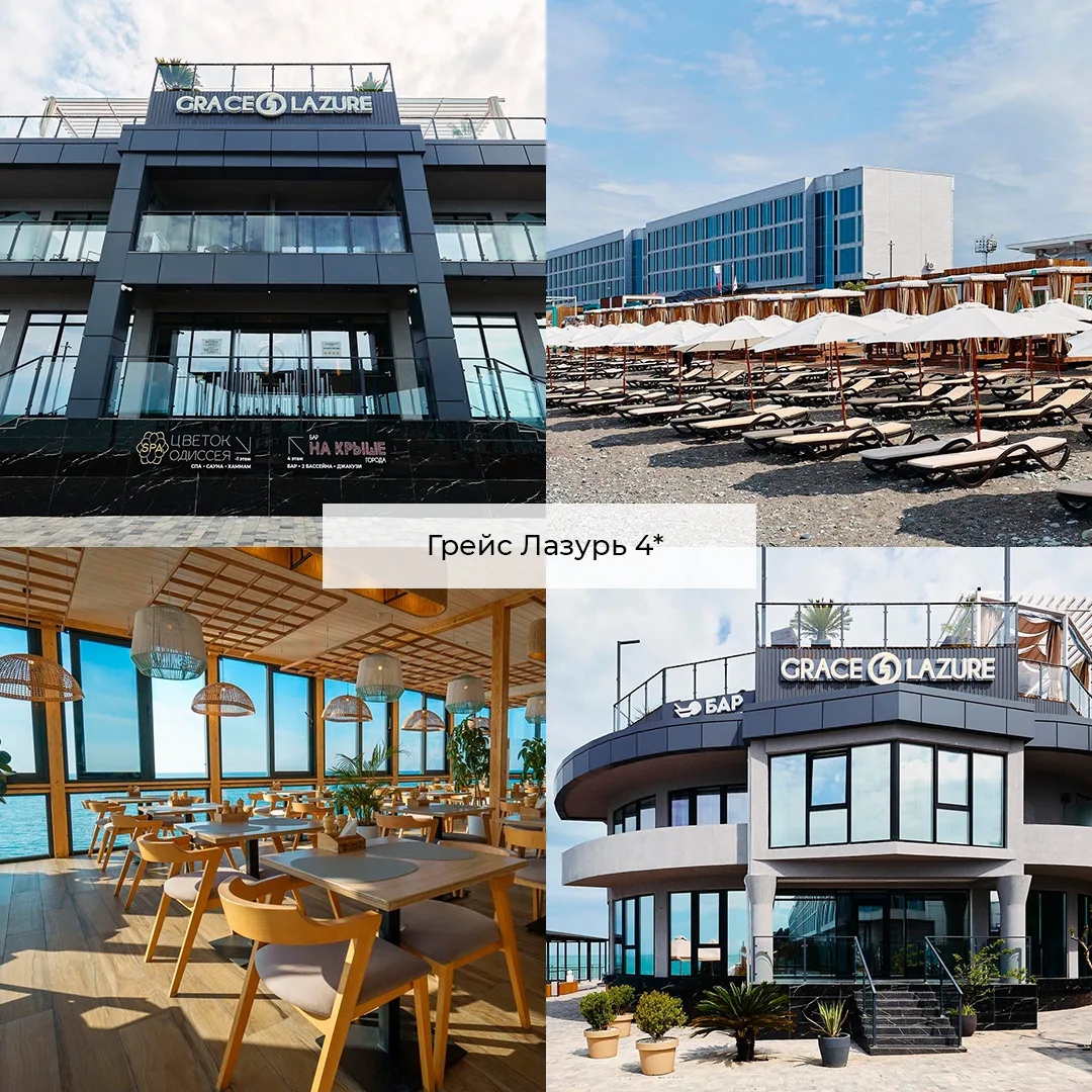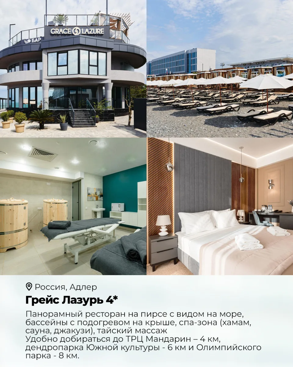🔹 Грейс Лазурь 4* — находится на первой линии в центре Адлера, в 50 метрах от собственного галечного пляжа. На территории работают ресторан и 2 бара, а также СПА с баней, сауной, джакузи и соляной комнатой.