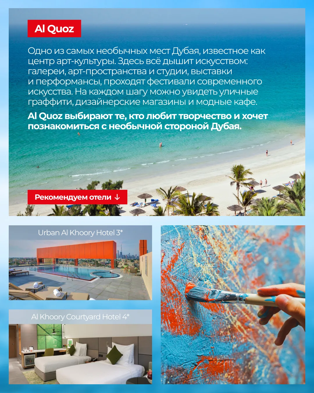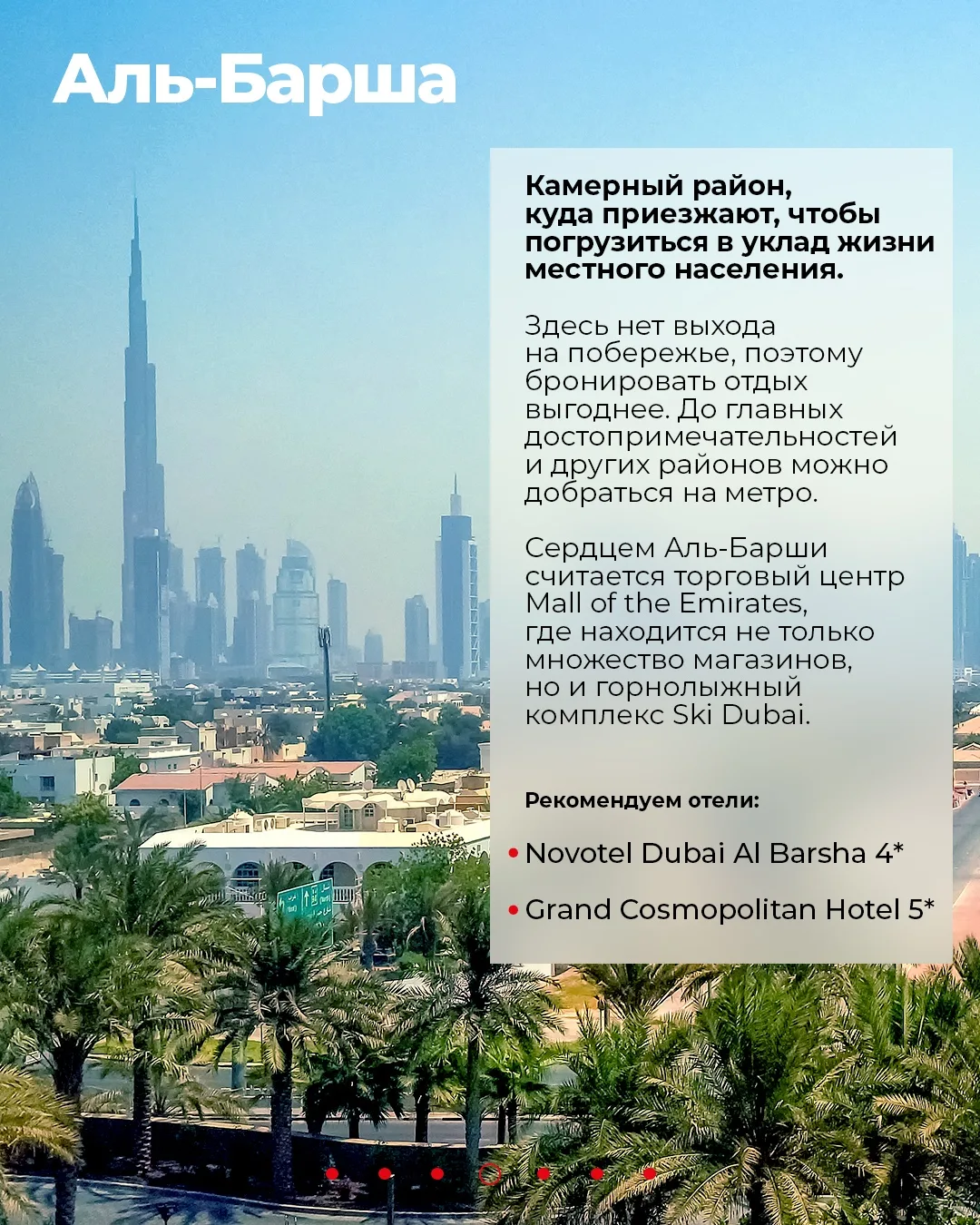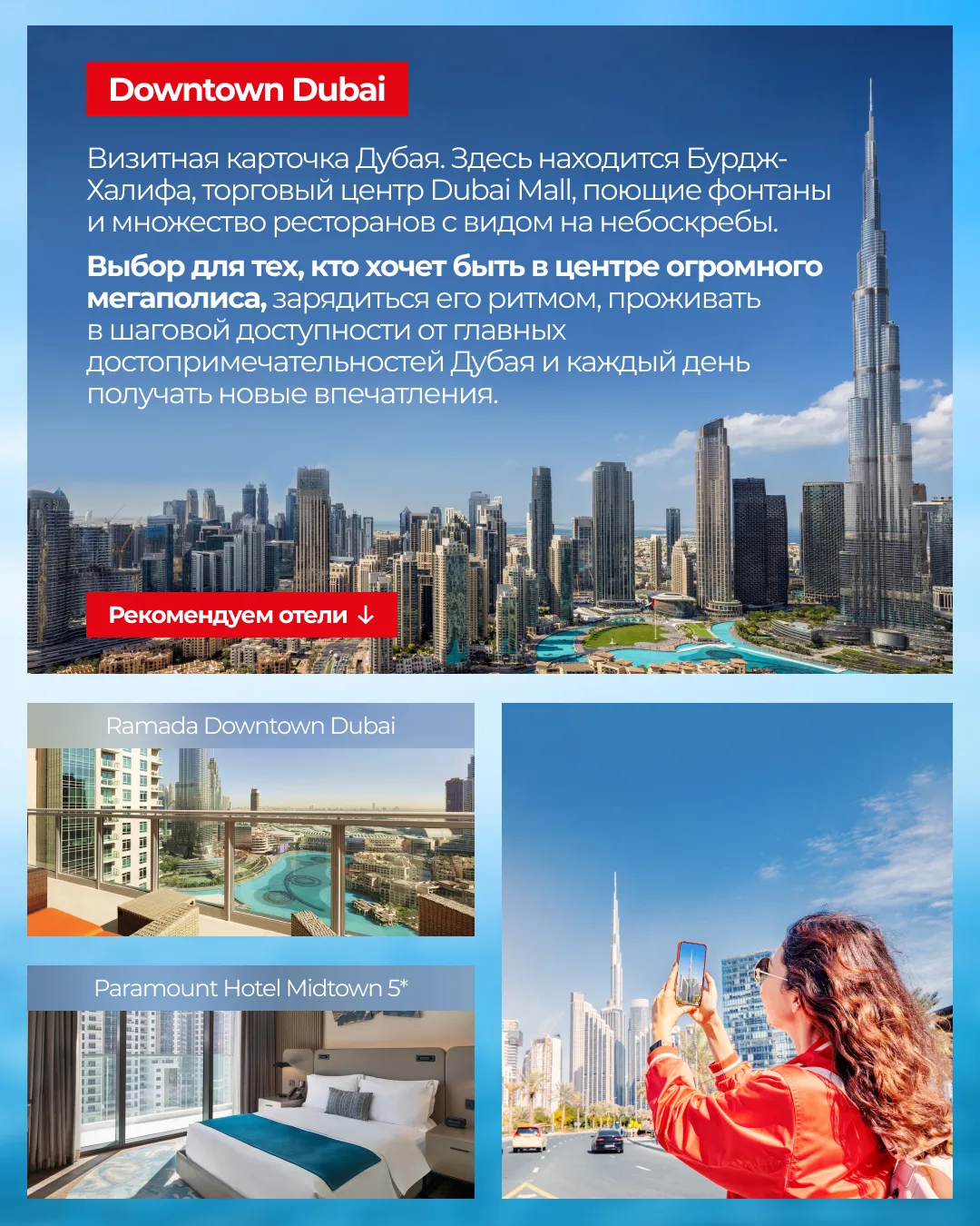 Небоскребы несомненно впечатляют, а теперь давай разберемся, что скрывается у их подножия. Каждый район Дубая — это свой ритм, свой стиль и даже свой способ провести отпуск.