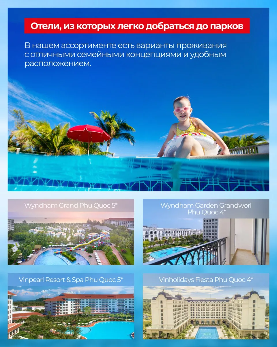 Остановиться рекомендуем в отелях: Sol By Melia Phu Quoc 5*, Vinholidays Fiesta Phu Quoc 4*, Wyndham Garden Grandworld Phu Quoc 4*, Wyndham Grand Phu Quoc 5*.