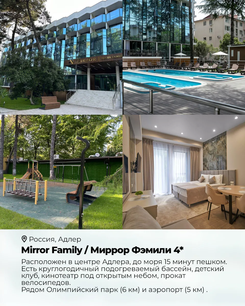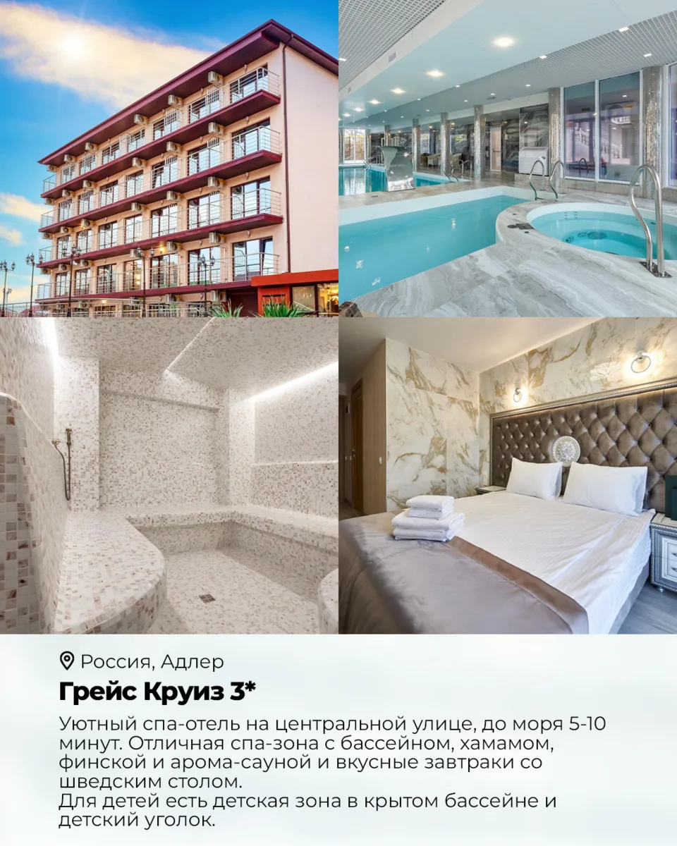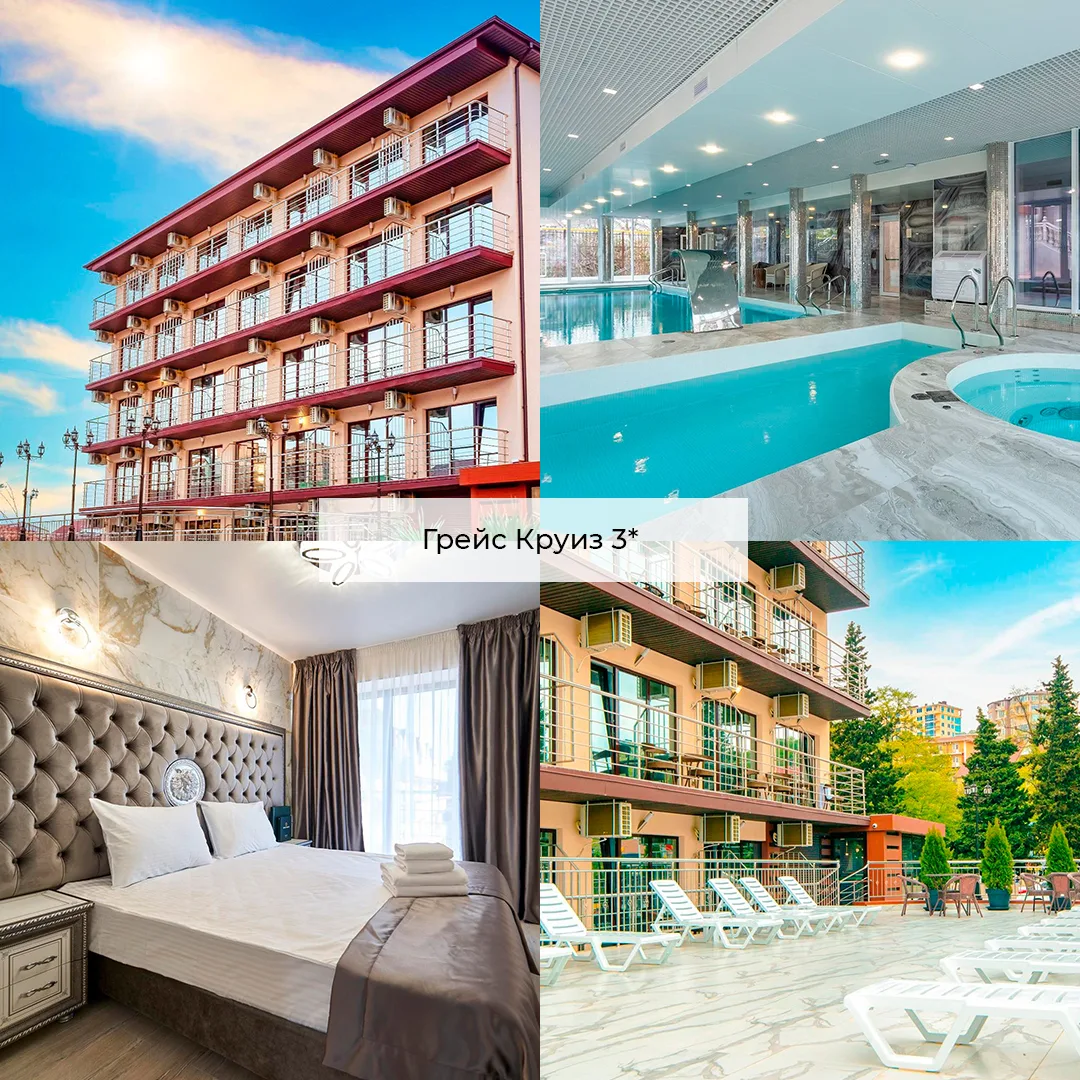 🔹 Грейс Круиз 3* — уютный СПА-отель в самом сердце курортного городка Адлера. В отеле два корпуса. В первом: СПА-центр «Цветок Одиссея» с крытым подогреваемым бассейном, сауной и термальной зоной. Во втором корпусе работает ресторан.