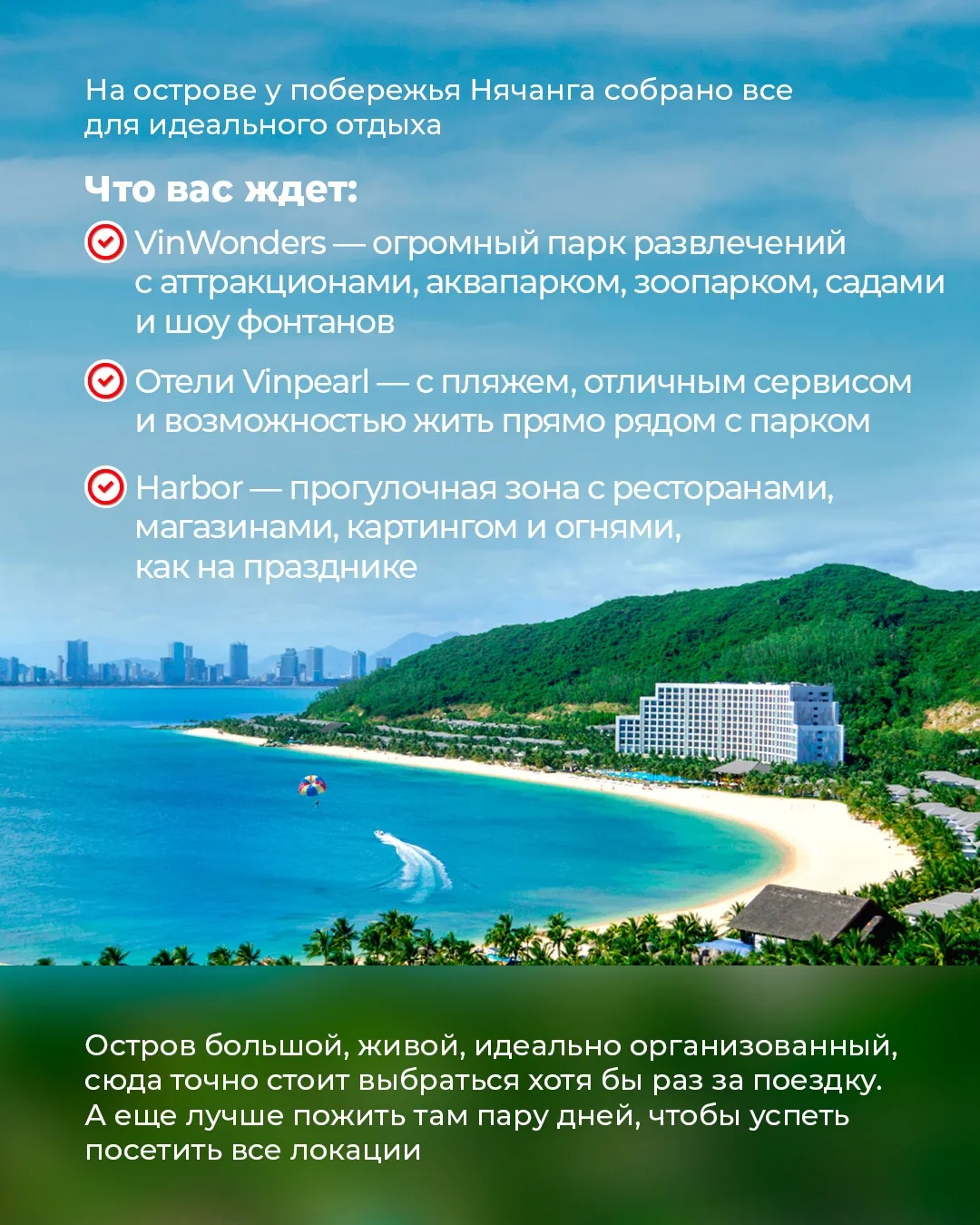 Теплое море, зоопарк с жирафами, аквапарк, аттракционы, колесо обозрения, кафе, картинг, шоу фонтанов и отели прямо у этого великолепия — да, это всего один остров рядом с Нячангом!