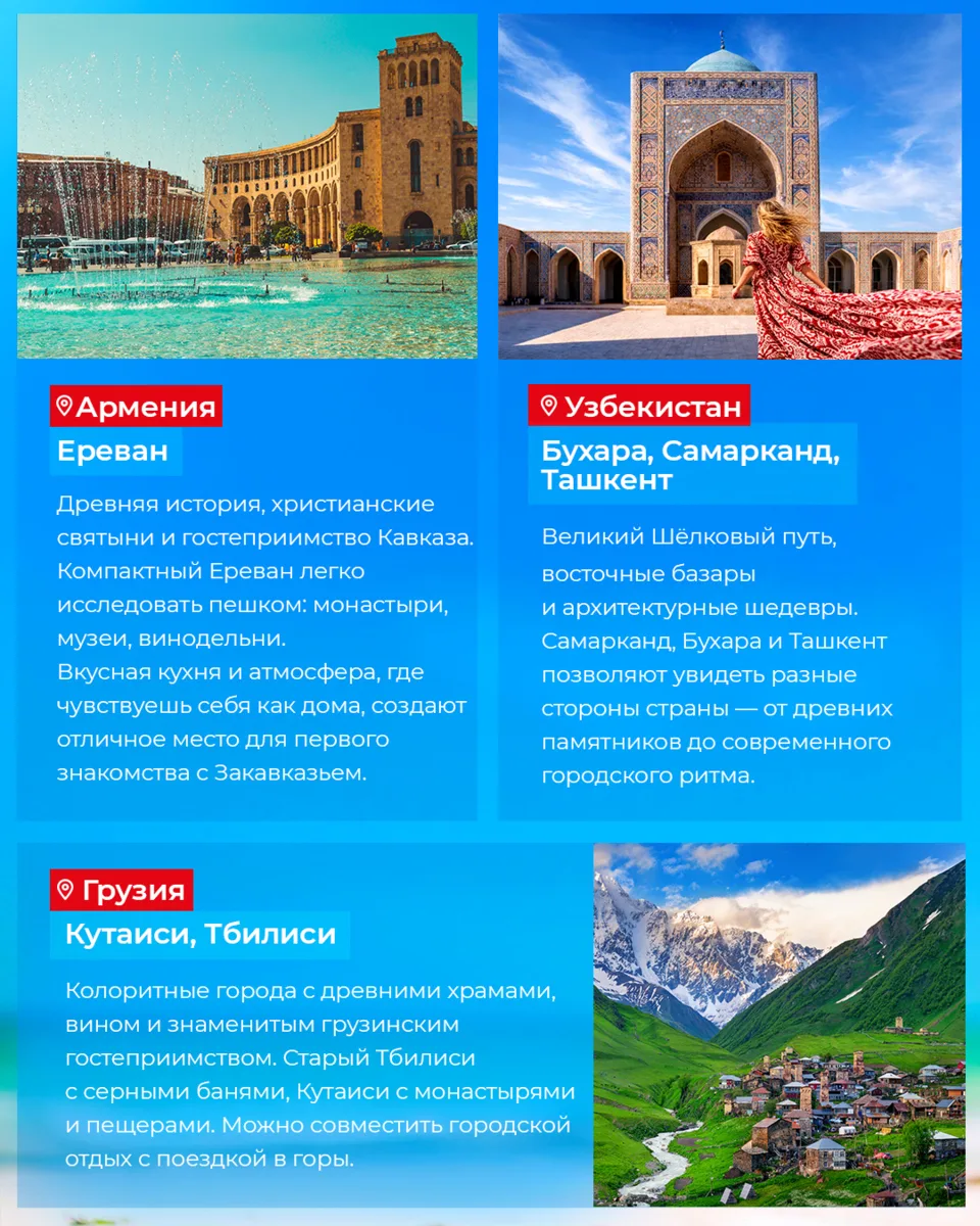 Экскурсионные туры в Грузию и Армению — возможность детально изучить главные достопримечательности и места направлений, познакомиться с их культурой, кухней, природой и историей.