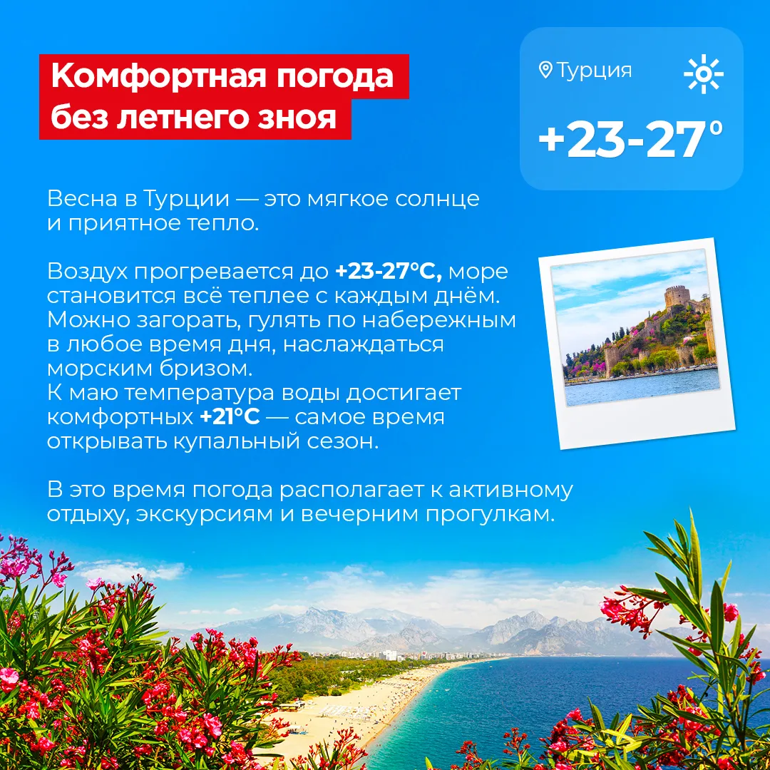 🌴Маленькая подсказка: наиболее теплым в мае будет море в Анталье, Белеке, Кемере, Сиде, Алании.