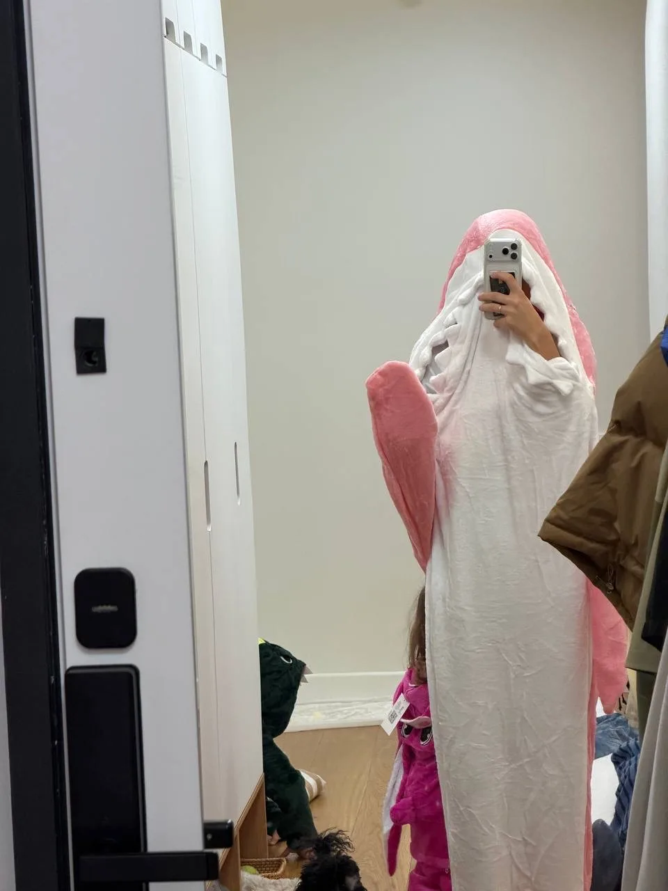 Мы дома устроили настоящий маскарад! Я купила костюм акулы, и мы носились по дому под «Baby Shark». Помню, как в моем подростковом возрасте были популярны кигуруми - уютные пижамы-звери. Мода прошла, а драйв остался! Решила вспомнить былое и просто кайфануть вместе с детьми.