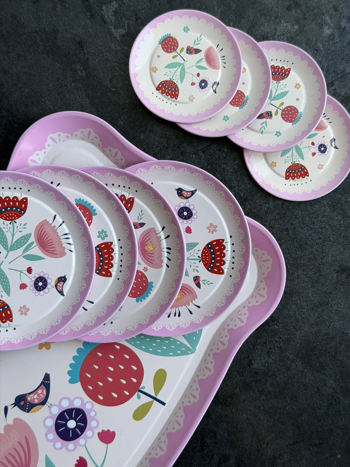 В этом наборе идет: поднос, чайник, 4 большие тарелки, 4 маленькие тарелки, 4 чашки.