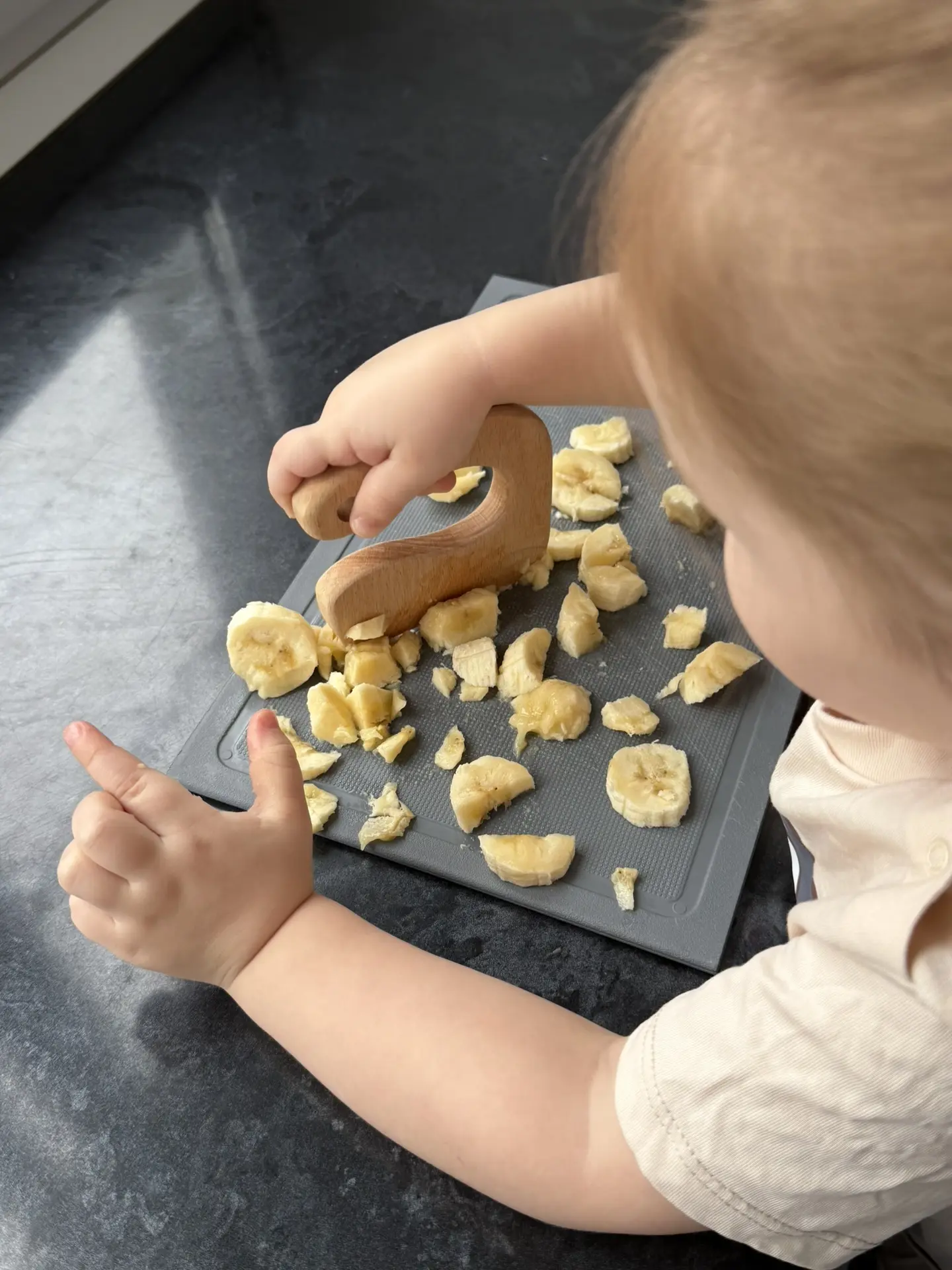 Очень люблю этот детский монтессори нож, когда нужно занять ребенка на кухне. Софа резала банан 15-20 минут😂