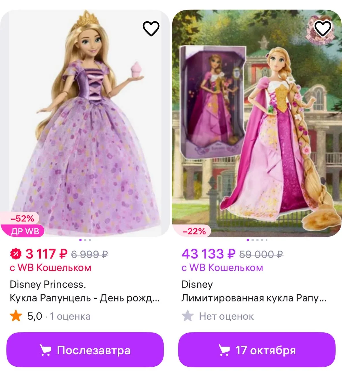 Вот такая Рапунцель слева - это единственный приемлемый по цене вариант, который мне показался похожим на классическую принцессу.