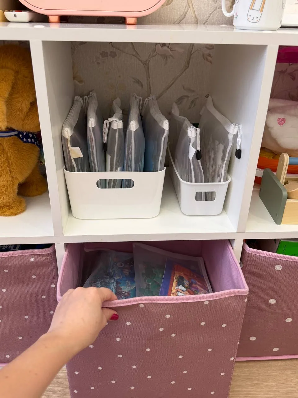 А сами мешочки складываю вот в такой пластиковый органайзер, который компактно умещается в стеллаже. И раз в неделю меняю мешочки, чтобы Софе не надоедали одни и те же пазлы.
