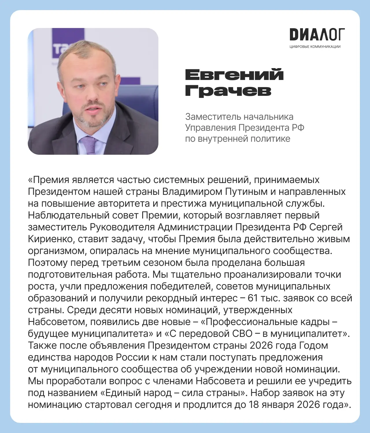 💬 Роль проекта в развитии территорий и поддержке местных инициатив подчеркивает гендиректор АНО «Диалог» и АНО «Диалог Регионы», член Наблюдательного совета Премии Владимир Табак: