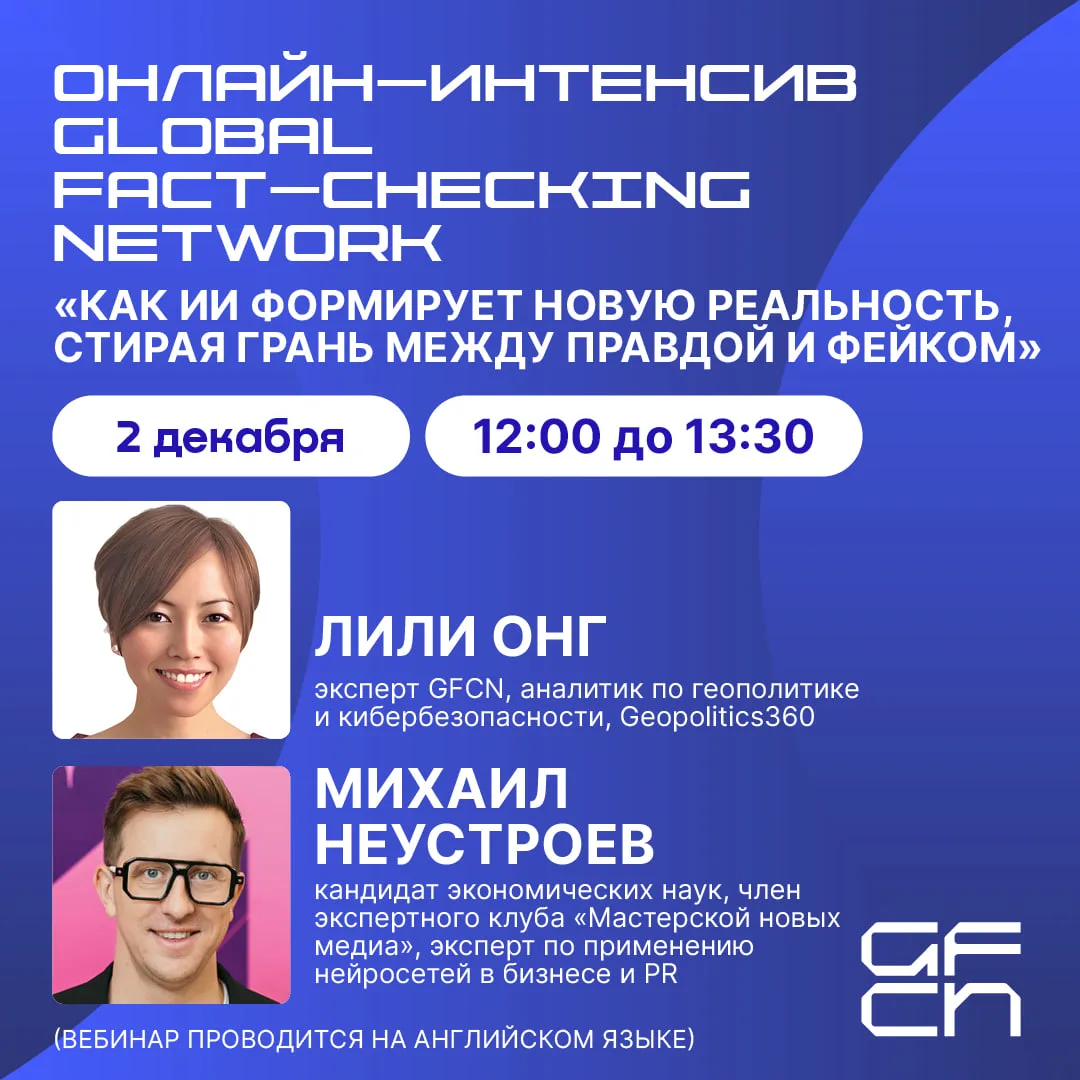Сергей Маклаков, начальник управления по противодействию недостоверной информации АНО «Диалог Регионы», поделится актуальными трендами и угрозами в мире дезинформации. А эксперт GFCN Тимофей Ви проведет детальный практический разбор методов проверки информации с live-примерами.