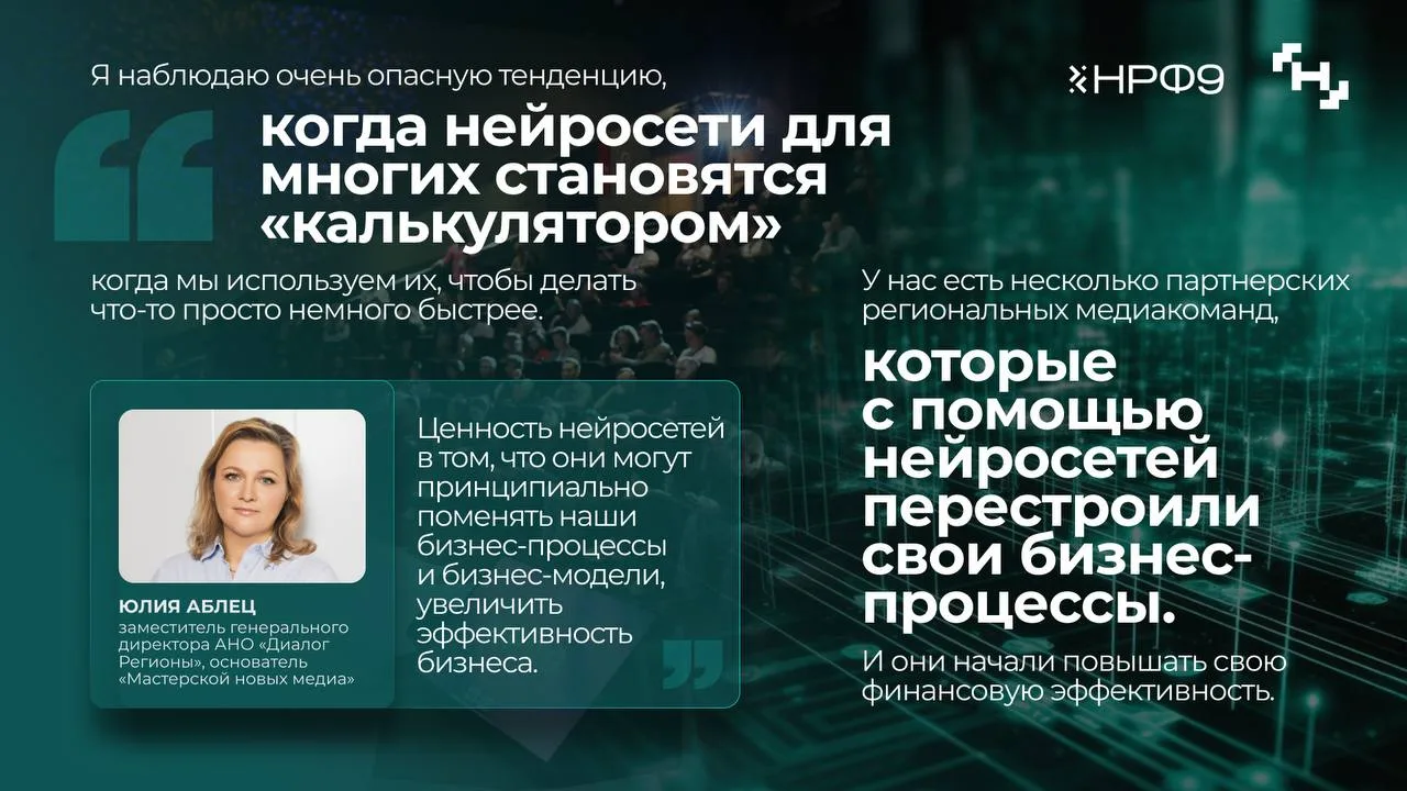 Но как взять от нейросетей максимум? На Национальном рекламном форуме об этом рассказала замгендиректора АНО «Диалог Регионы», основатель Мастерской новых медиа Юлия Аблец.