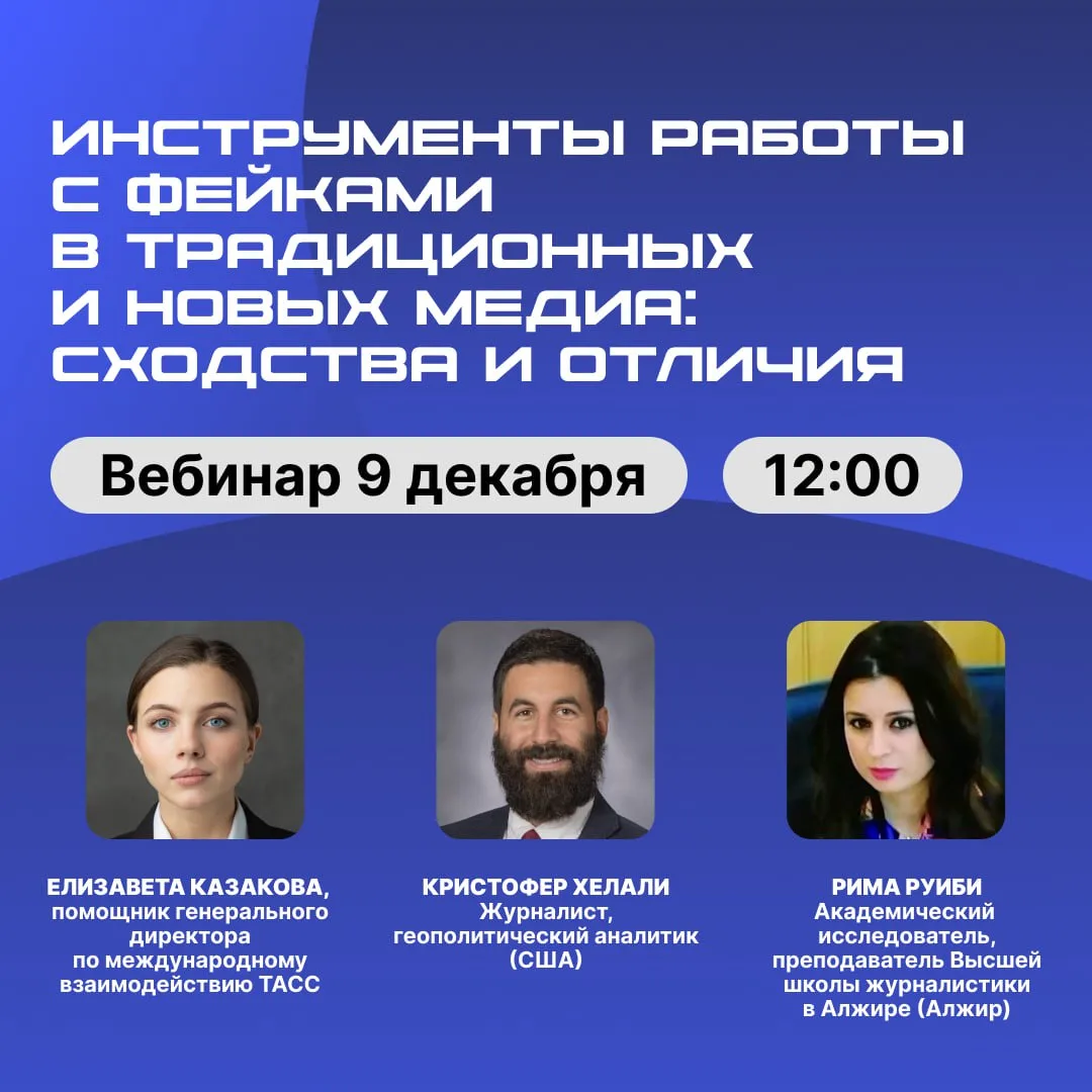 🗣 Елизавета Казакова, помощник генерального директора по международному взаимодействию ТАСС, расскажет, как российское информагентство распознает и разоблачает фейки на практике.