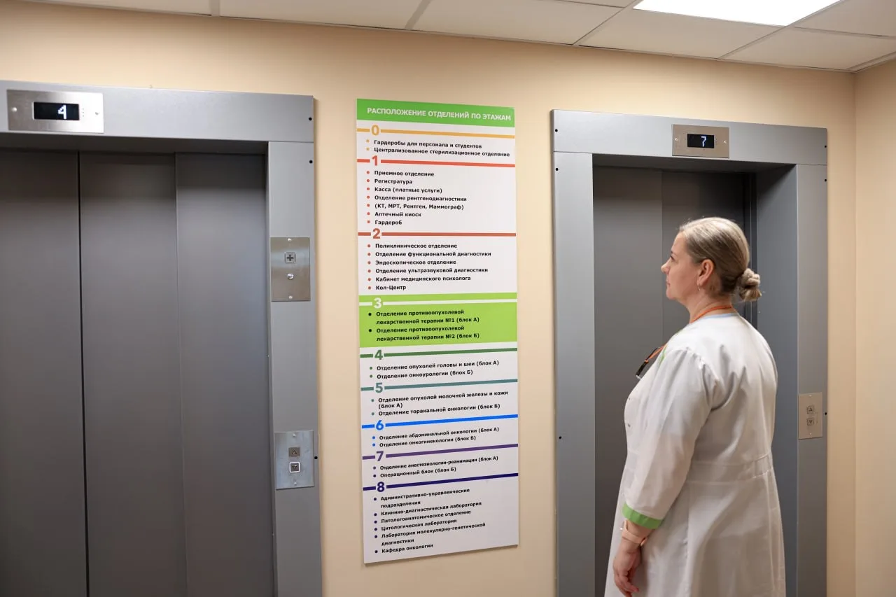 Восьмиэтажное здание общей площадью почти 21 тысяч кв. м включает стационарные отделения хирургического и химиотерапевтического профилей на 175 круглосуточных коек, а также поликлинику с диагностическими подразделениями.