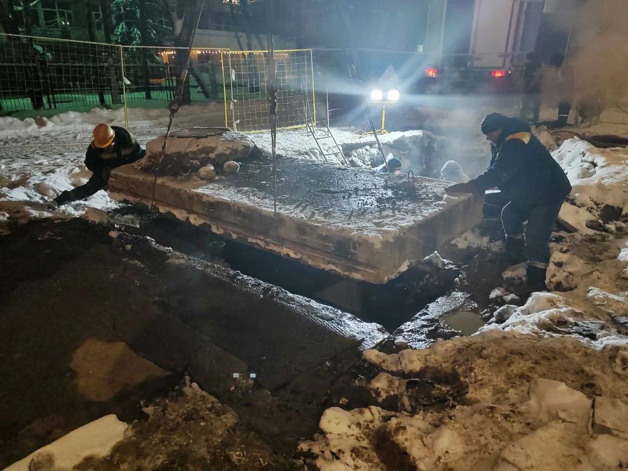 Аварийно-восстановительные работы ведутся одновременно на двух участках. На улице Маршала Конева повреждённый участок тепловой сети демонтирован, ведётся монтаж нового трубопровода.
