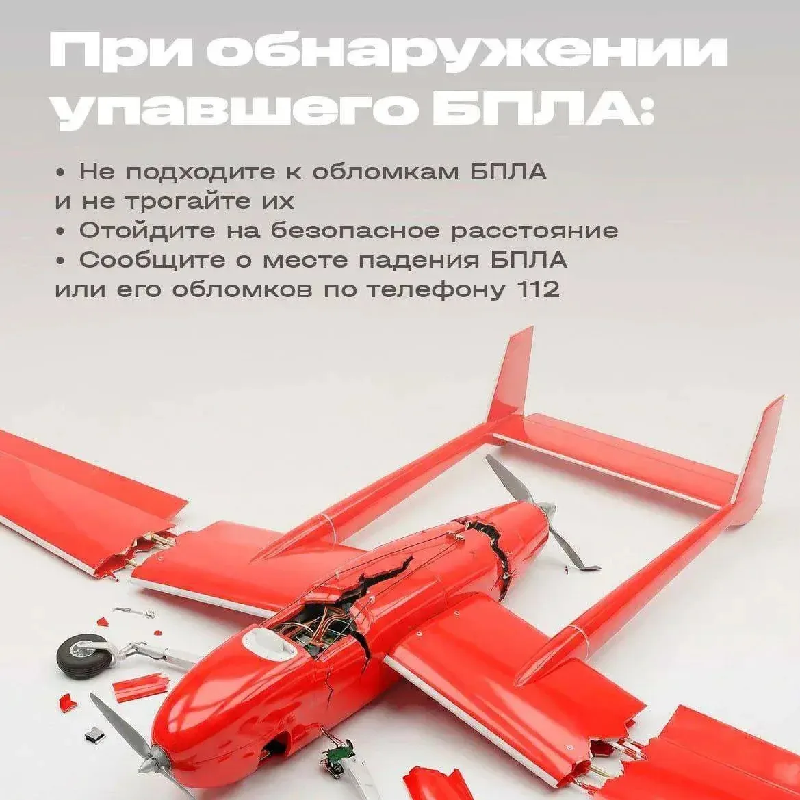 Напоминаю о необходимости соблюдения правил безопасности. Если вы обнаружили части беспилотных летательных аппаратов, не приближайтесь к ним. Сообщите об их местонахождении по номеру 112.