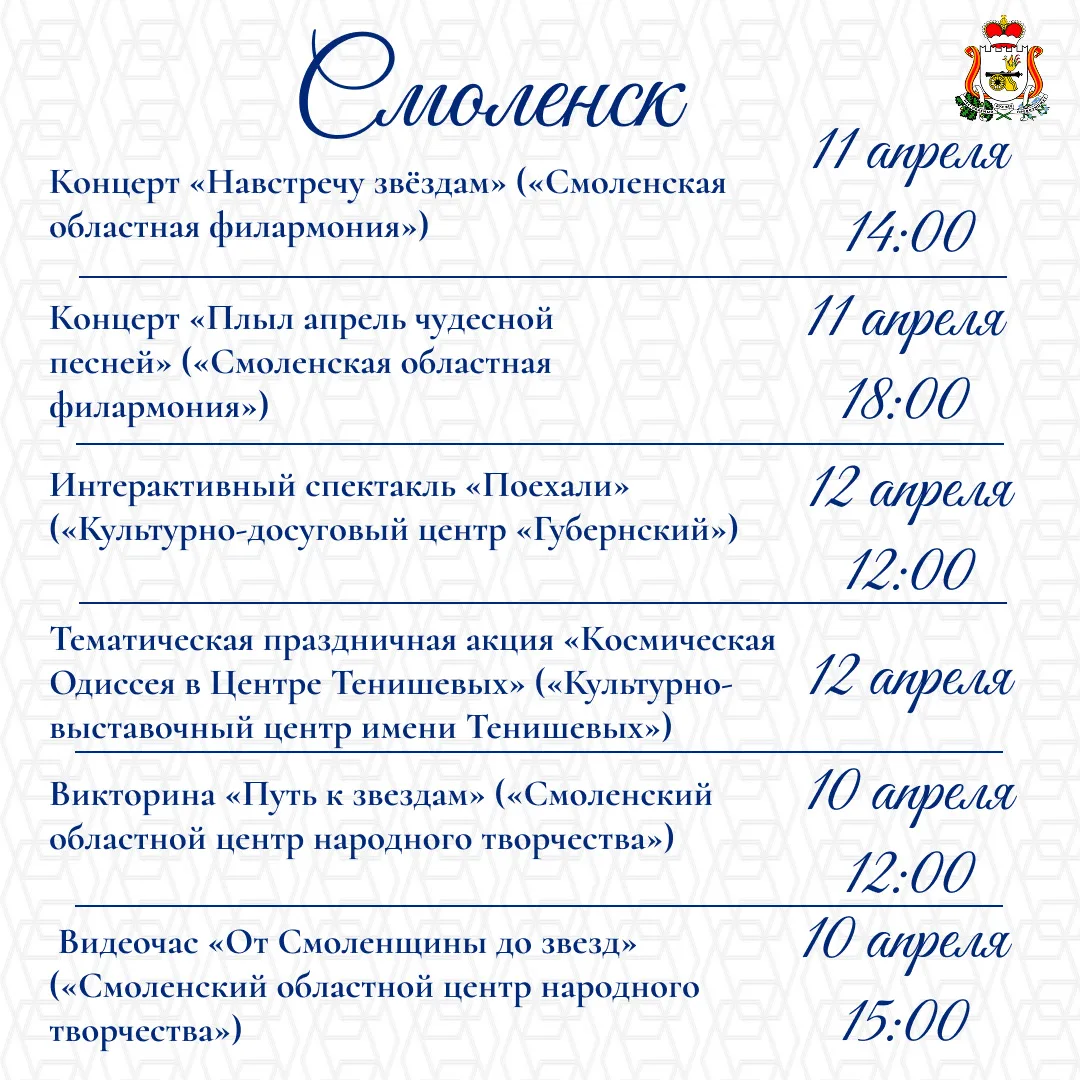 В Смоленском государственном академическом драматическом театре имени А.С. Грибоедова 9 и 12 апреля состоятся показы спектакля "Он сказал: "Поехали!". 10 апреля в Смоленском областном центре народного творчества состоятся викторина "Путь к звездам" и видеочас "От Смоленщины до звёзд", посвященный истории отечественной космонавтики. В этот же день в культурно-досуговом центре "Губернский" пройдет тематическая программа "Звёздный путь России. От Гагарина до наших дней". 11 апреля в Смоленской областной филармонии состоятся концертные программы "На встречу звёздам" и "Плыл апрель чудесной песней".