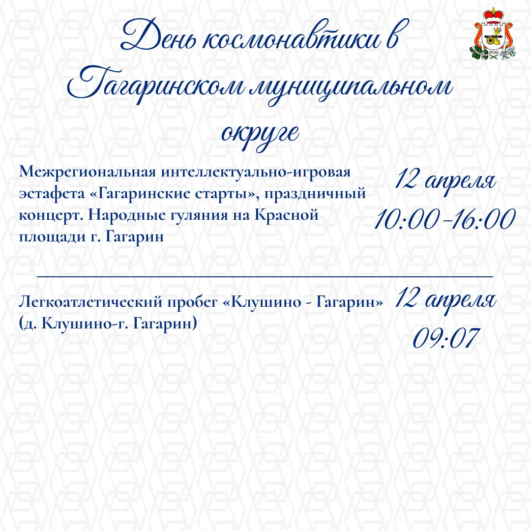 Масштабные праздничные события пройдут и в муниципальных образованиях. С особым размахом юбилейную дату отметят в Гагаринском муниципальном округе – на родине первого космонавта планеты. Здесь запланированы легкоатлетический пробег "Клушино – Гагарин", народные гуляния на Красной площади окружного центра, квест "Под Гагаринской звездой", межрегиональная интеллектуально-игровая эстафета "Гагаринские старты", "Гагаринский диктант", праздничные концерты и торжественные митинги.