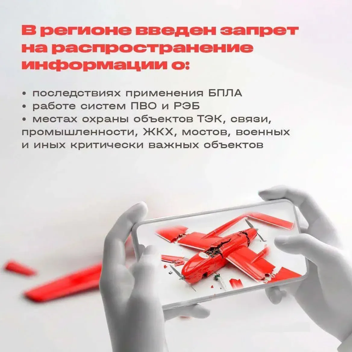 Обращаю внимание, что в регионе введен запрет на распространение сведений о последствиях применения БПЛА, работе систем ПВО и РЭБ, а также о местах охраны объектов ТЭК, связи, промышленности, ЖКХ, мостов, военных и иных критически важных объектов.