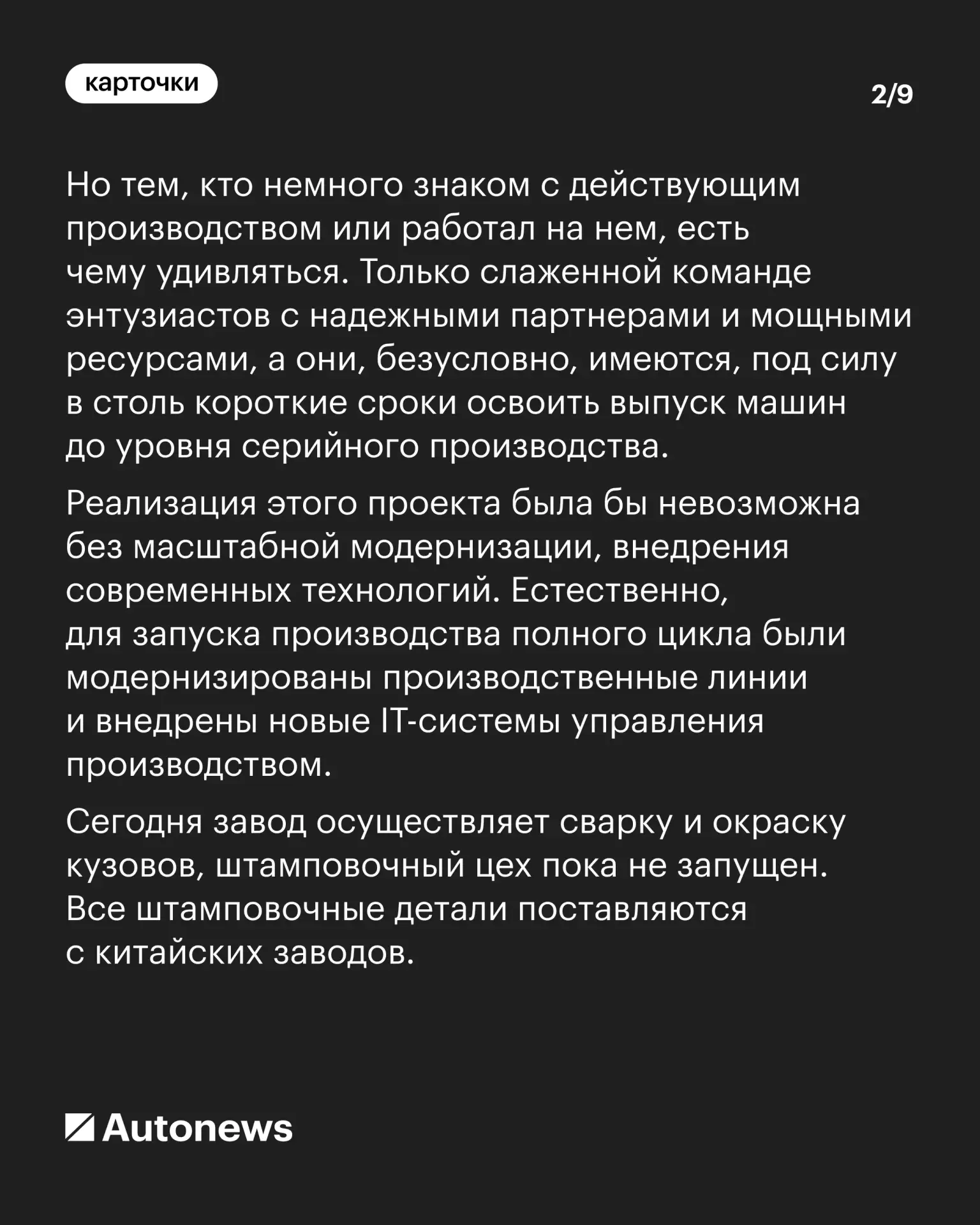 «Сейчас мы будем рассматривать вариант одного крупного завода. У нас будет технологический партнер. Название пока говорить не можем, но это нынешний партнер компании, автомобили которого мы продаем», — пояснила она.