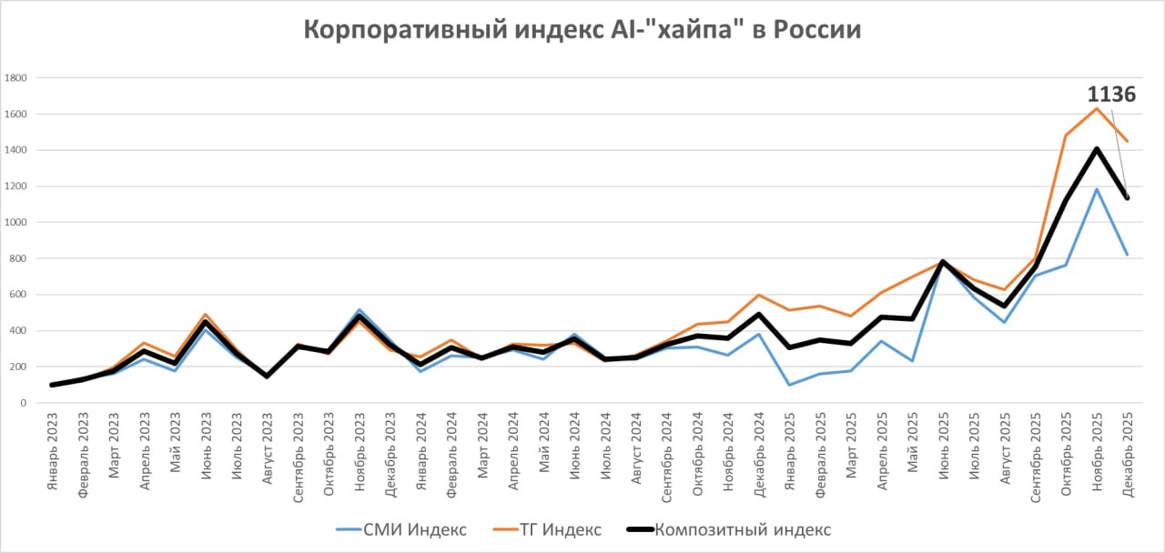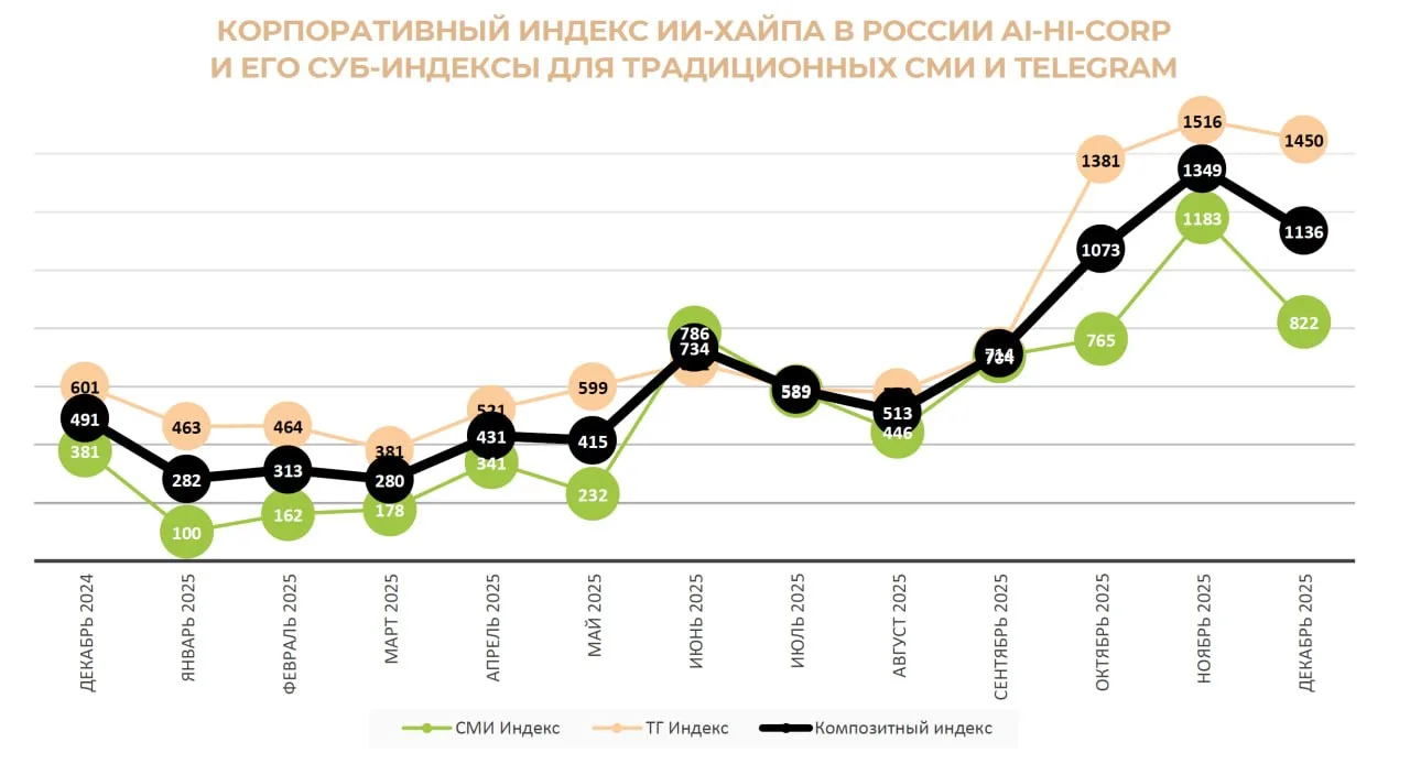 Корпоративный же индекс ИИ-хайпа (AI-HI-CORP) от @anti_agi в декабре, напротив, снизился с 1407 до 1136 пунктов, то есть фактически до значения октября (1123 пункта), что не удивительно, ведь ноябрь отметился несколькими профильными мероприятиями, что и обеспечило рекордное значение индекса в том месяце.