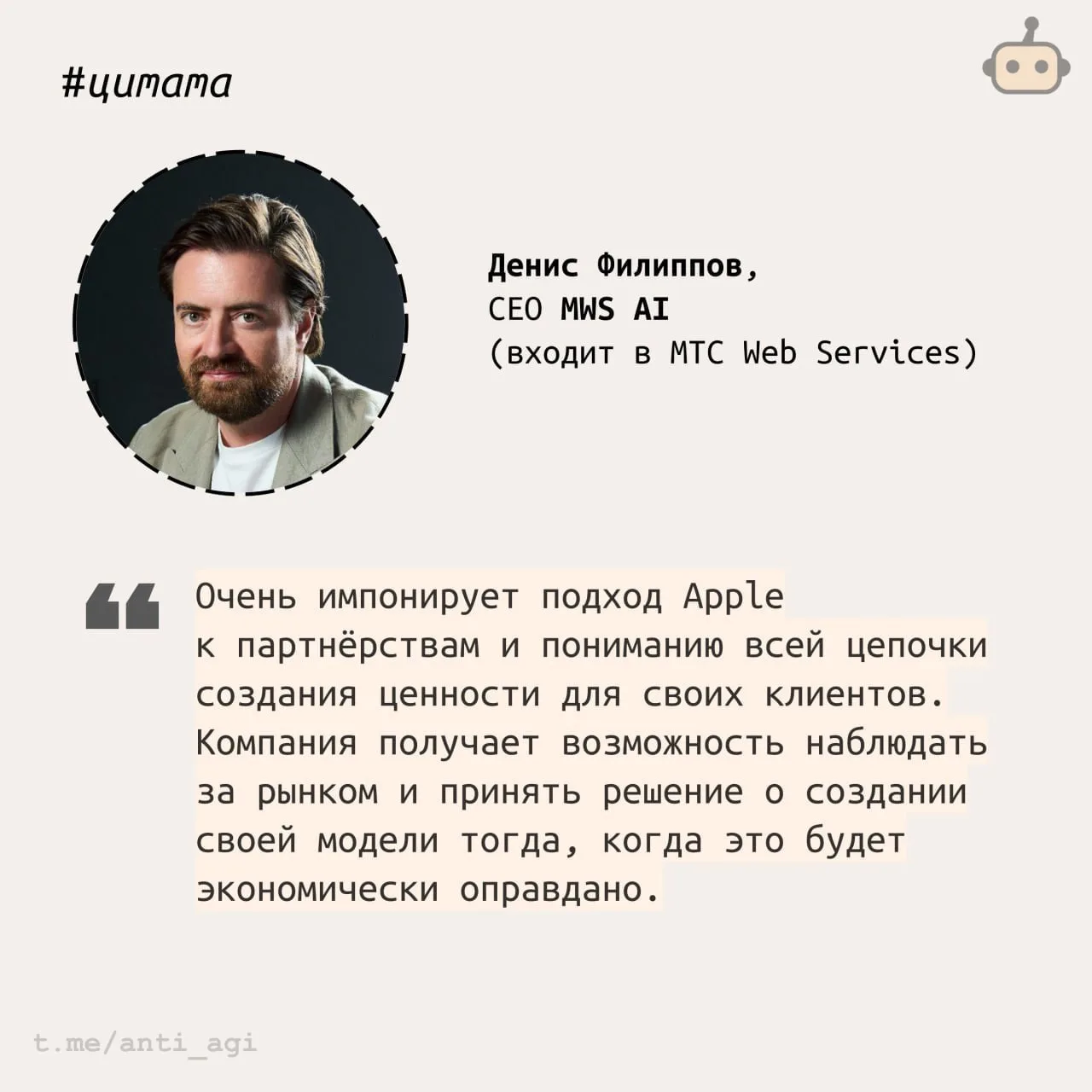 Tl;DR Apple своей экономией хвастаться не с руки. Пока компания обкатывает типовые сценарии с помощью партнёров, внимательно следя за рынком. А когда все шишки будут набиты, можно будет вывести и свою SOTA. Чтобы маленькими шажками, но всё же сделать Siri great again...