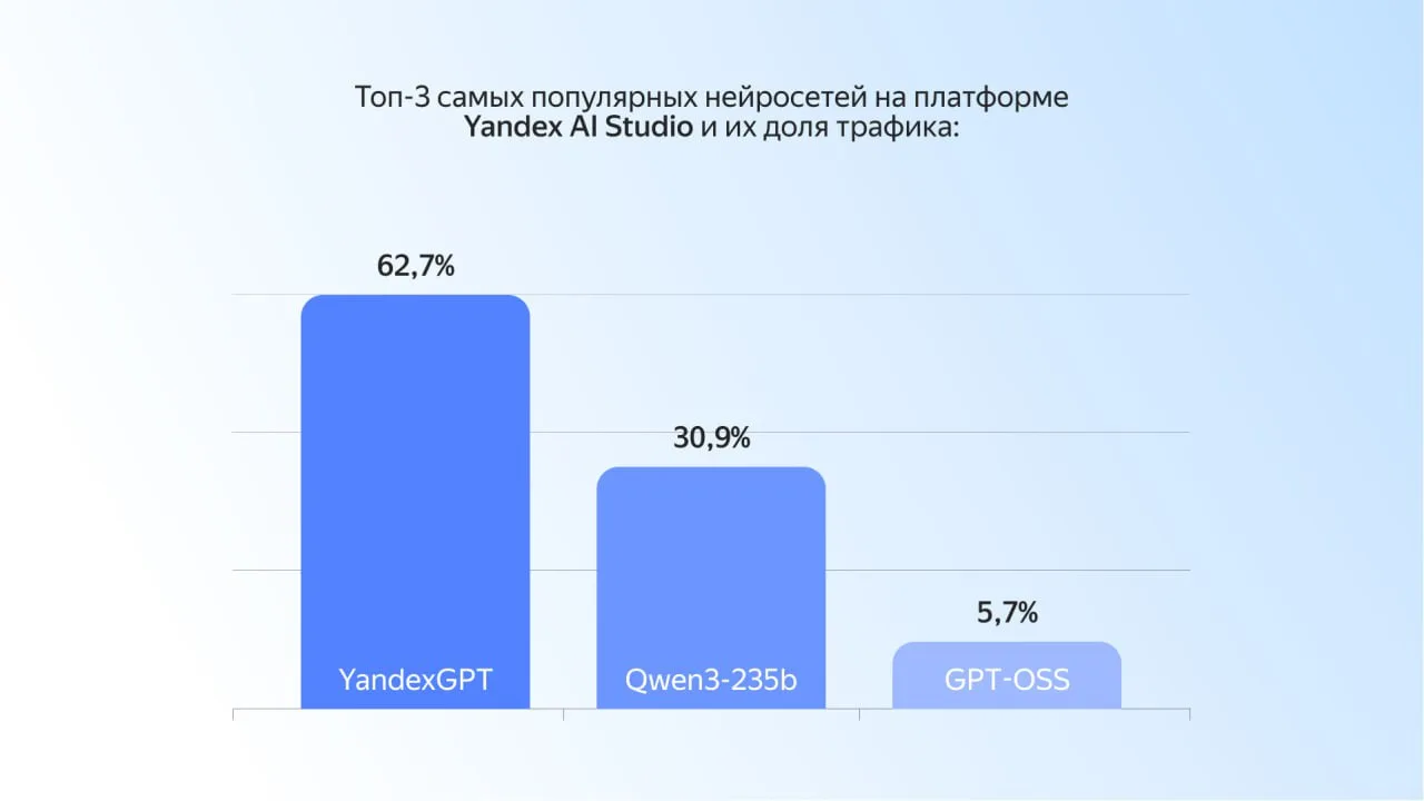 В топе по популярности — YandexGPT (62,7%), следом идут Qwen3-235b от AliBaba Group (30,9%) и GPT-OSS от OpenAI (5,7%). Но что обеспечило высокий спрос на собственные модели компании?