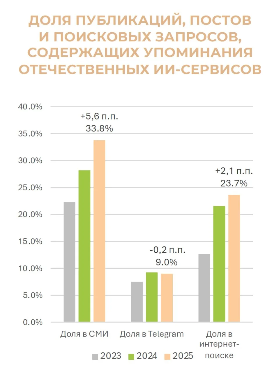 Интерес к отечественному ИИ растет быстрее, чем к мировому. Наш индекс ИИ-хайпа, рассчитанный для российских сервисов, AI-HI-RU, вырос на 96%, в полтора раза сильнее основного индекса AI-HI. Растет и доля их упоминаний в СМИ и в интернет-поиске. А вот в постах блогеров в Telegram доля упоминаний отечественных сервисов невысока и стагнирует.