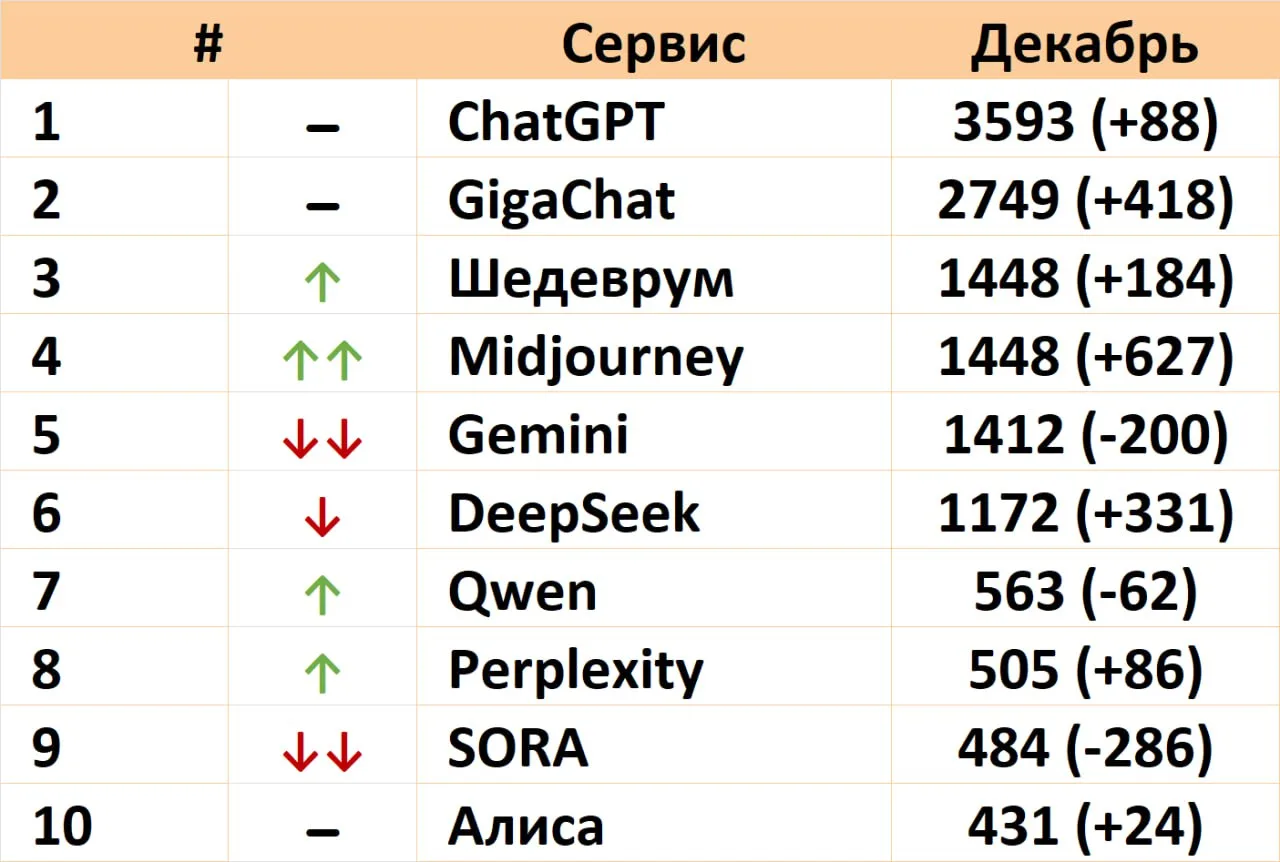 В результате эти российские сервисы занимают второе и третье места в нашем декабрьском рейтинге, где все так же продолжается вечное царство ChatGPT. В целом, в расстановке не произошло значительных изменений: максимум движения в рейтинге – на два места*. Это произошло с SORA от OpenAI – генератор видео плавно скатывается вниз по мере того, как новизна проходит, а дополнительных смыслов в нем пока не проявляется, и сейчас занимает девятое место, что грозит ему вылетом из топ-10 уже в январе. Отметим и постепенное снижение интереса к DeepSeek – пользователи приняли его, как полезный инструмент, но со времени первых громких релизов прошел уже год, и если в начале 2025 года он грозил свергнуть ChatGPT с пьедестала, в том числе и нашем рейтинге, то в декабре DepSeek уже на шестом месте.