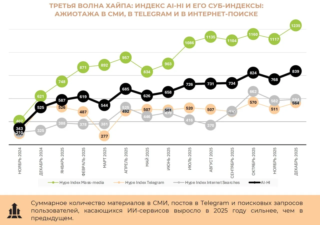 Третья волна ИИ-хайпа, начавшаяся в российском медиаполе в декабре 2024 года, продолжалась весь 2025 год. Несмотря на очевидное насыщение аудитории темой искусственного интеллекта, упоминаемость сервисов в основном росла. Основной индекс AI-HI от @anti_agi вырос год к году на 60% (файл исследования в первом комменте).
