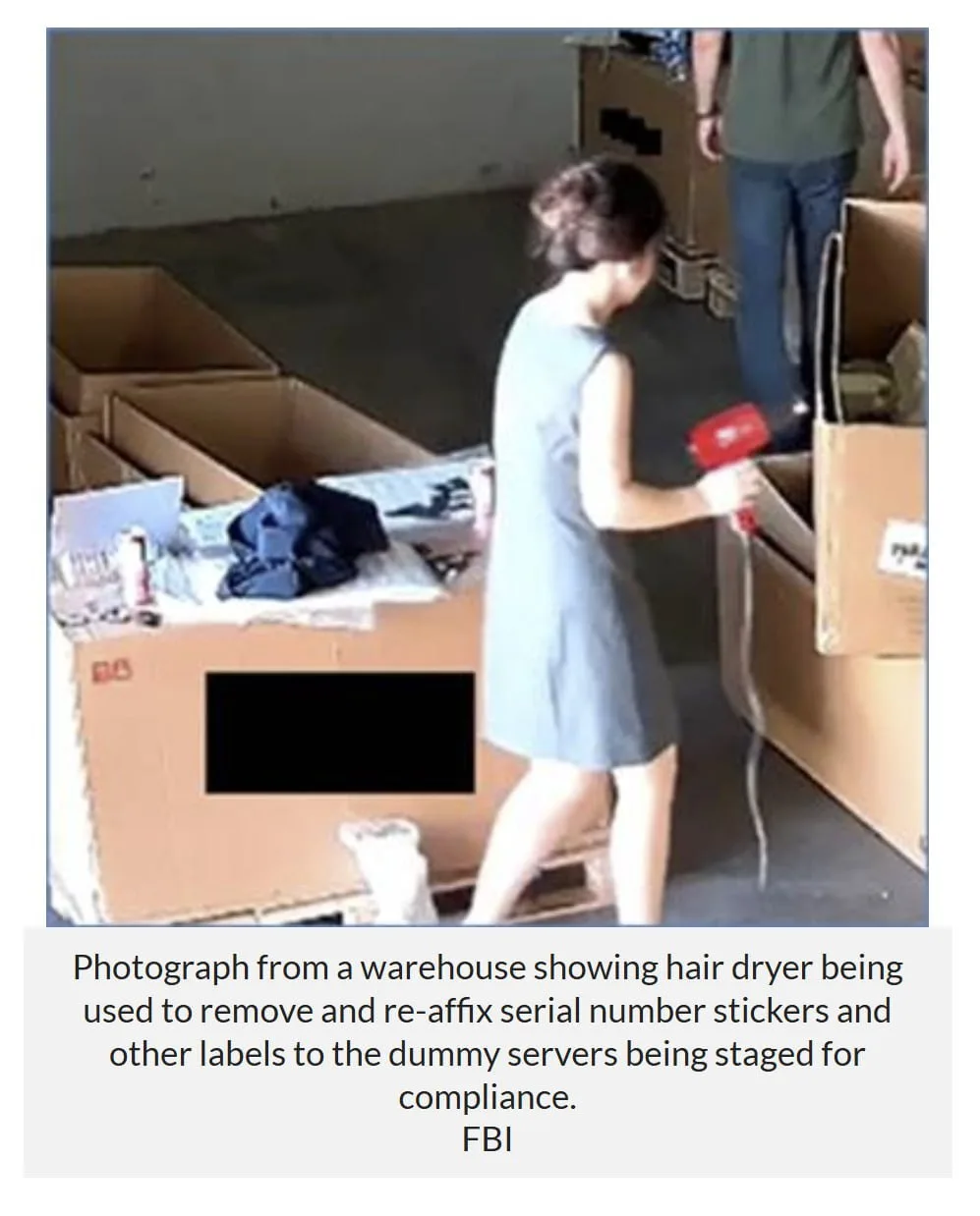 Формальным покупателем всего этого "железа" якобы выступила одна и та же фирма. Для неё изготавливали тысячи серверов-"пустышкек", хранящихся на складе. Записи с камер показали, как участники схемы переклеивали наклейки с серийными номерами с помощью обычного фена.