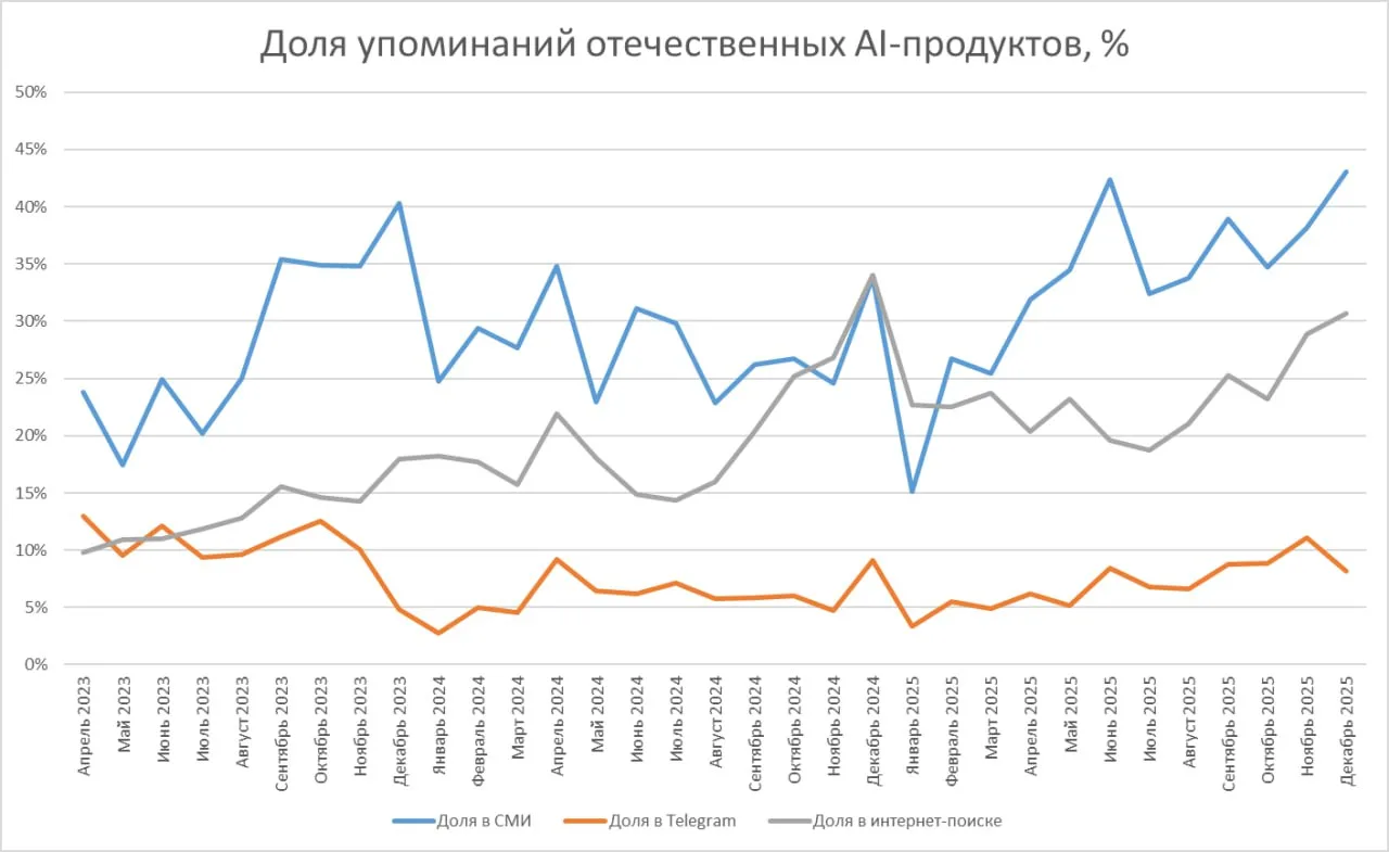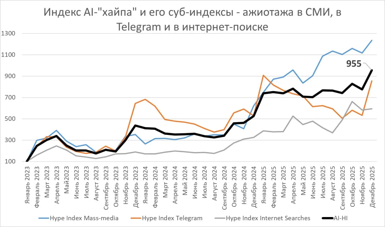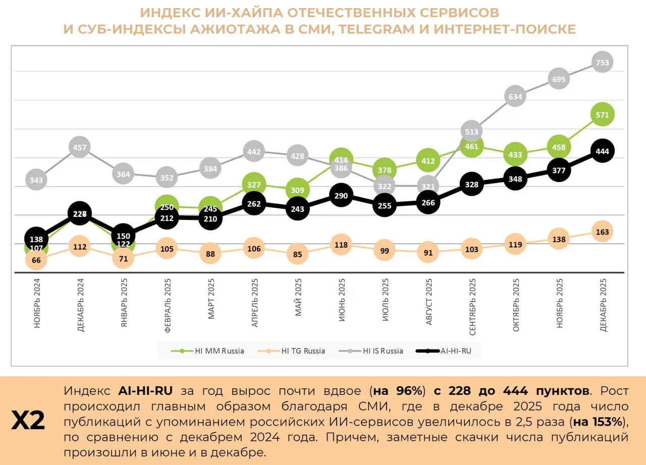 2025 год закончился для ИИ-хайпа в России на мажорной ноте: индекс хайпа вокруг ИИ (AI-HI), рассчитываемый ежемесячно @anti_agi, вырос на 23% до 955 пунктов. Однако, стоит напомнить, что он отражает число упоминаний тех или иных сервисов в СМИ, Telegram и интернет-поиске. И оно в самом деле выросло, однако все большую долю в них занимают упоминания утилитарные – за год качество генераций картинок выросло, и СМИ, в особенности мелкие, навострились использовать ИИ-сервисы для иллюстрирования своих текстов, в том числе совершенно не связанных с ИИ. С этим, к примеру, связано рекордное число упоминаний в СМИ в декабре сервисов GigaChat и Шедеврум.