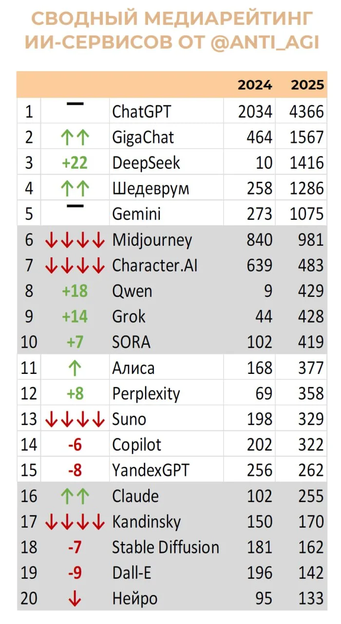 ChatGPT не только не сдает позиции, но даже укрепляет их, несмотря на официальную недоступность из России. Если в 2024 году медиарейтинг лидера был в 2,4 раза выше, чем у шедшего вторым Midjourney, то в прошлом году разрыв со 2 местом (теперь это GigaChat) вырос до 2,8 раз.