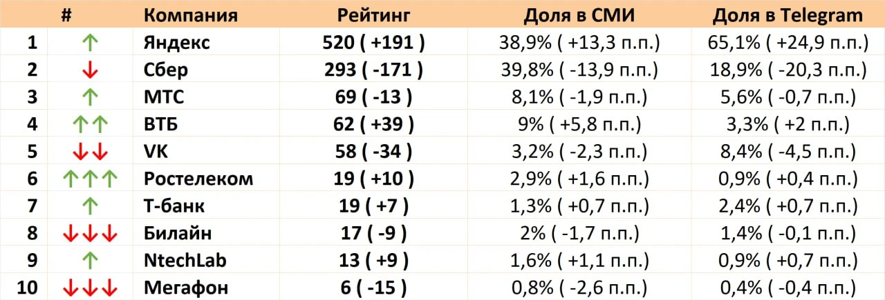 Яндекс и Сбер вновь поменялись в рейтинге местами – в ноябре благодаря конференции AI Journey на первом месте был Сбер, теперь там снова Яндекс. На третье место в декабре вырвался МТС. ВТБ поднялся в рейтинге сразу на два места – с 6 на 4, а VK, напротив – опустился с 3 на 5**. На три места вверх, с 9 на 6 переместился Ростелеком, на одном уровне с ним Т-Банк (7-е место) и Билайн (8-е место). Замыкают наш декабрьский рейтинг поднявшийся с последнего места на девятое NtechLab и Мегафон, опустившийся с седьмого места на последнее.
