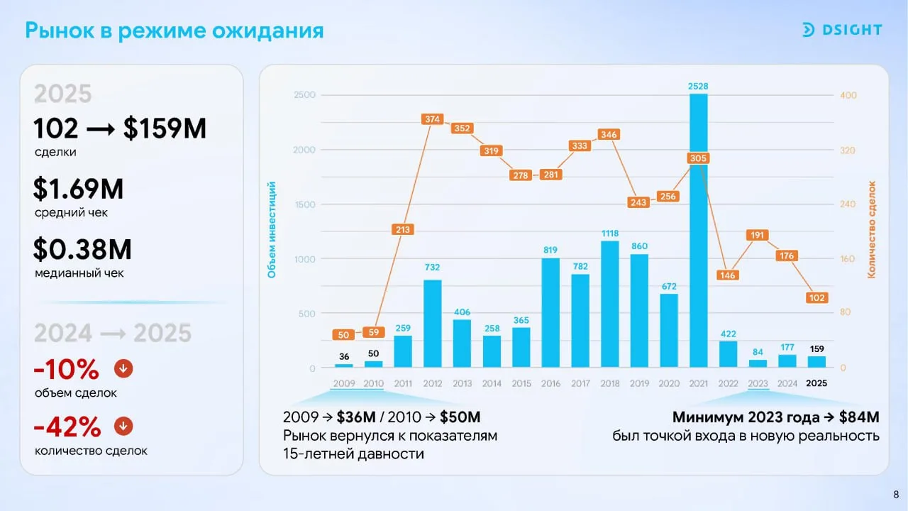 По итогам 2025 года инвестиционный фокус в России сместился к зрелым компаниям с подтверждённым спросом в IndustrialTech, Healthcare и деловом ПО, а вот сделки в секторах электронной коммерции остаются пока на стопе. Об этом говорится в исследовании Dsight, которое есть в распоряжении @antidigital.