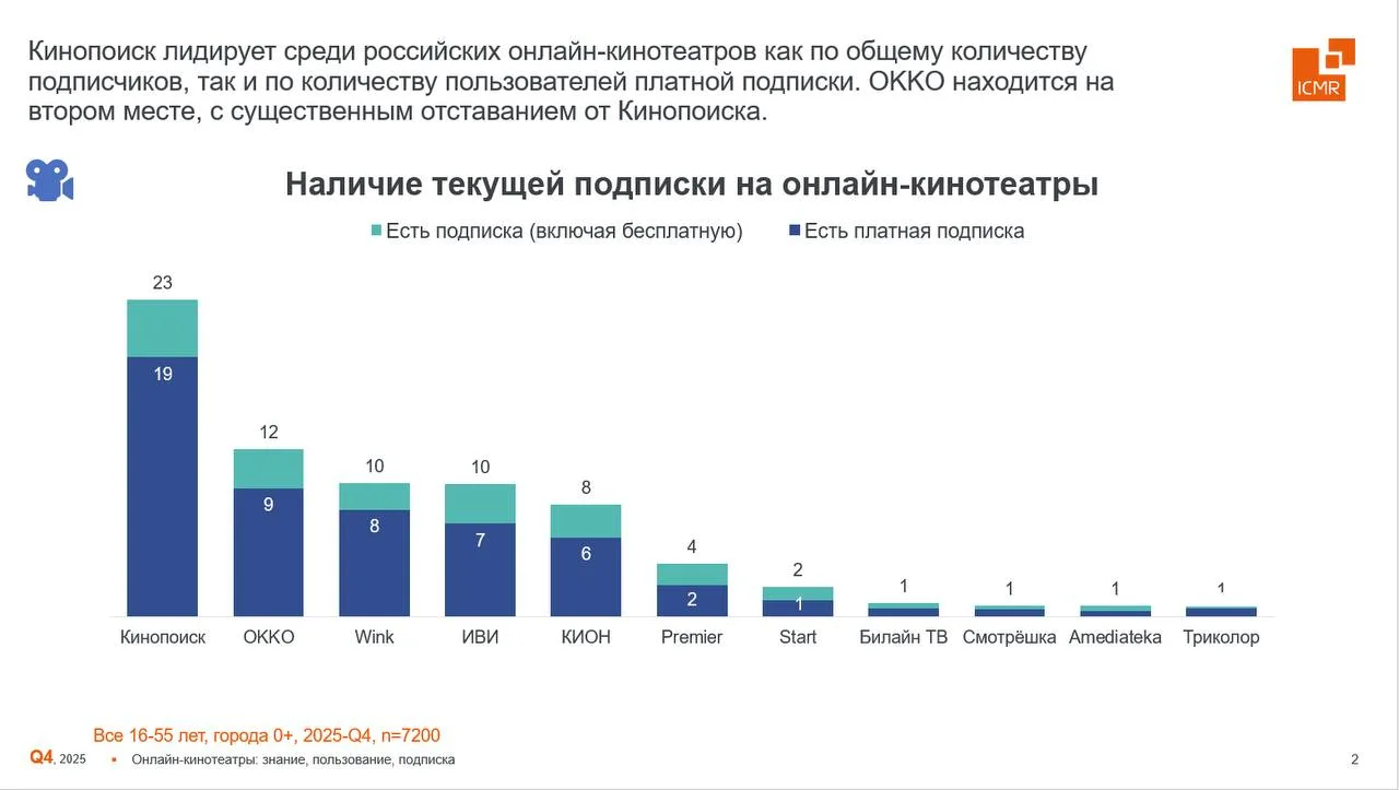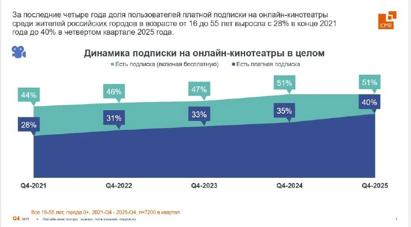 Исследовательская компания ICMR (ГФК-Русь) провела опрос среди жителей городов России — согласно его результатам, в четвертом квартале 2025 года 51% опрошенных пользовались подпиской на онлайн-кинотеатры, а 40% за нее платили.