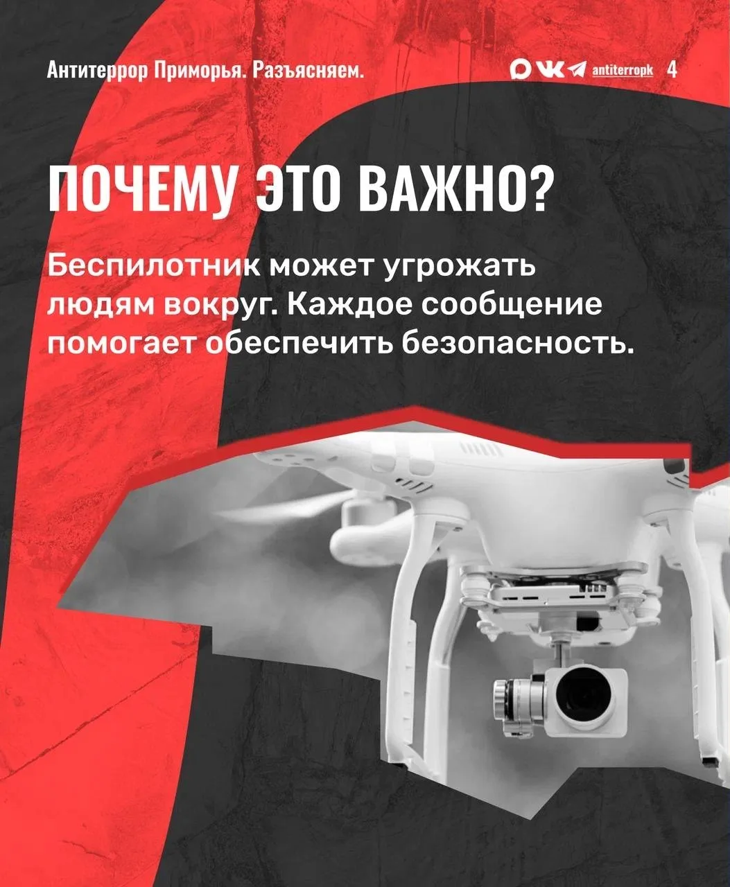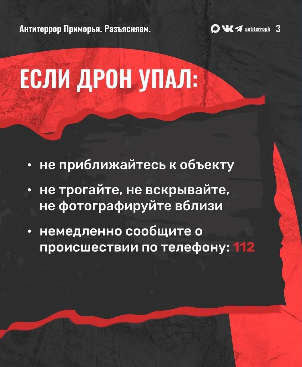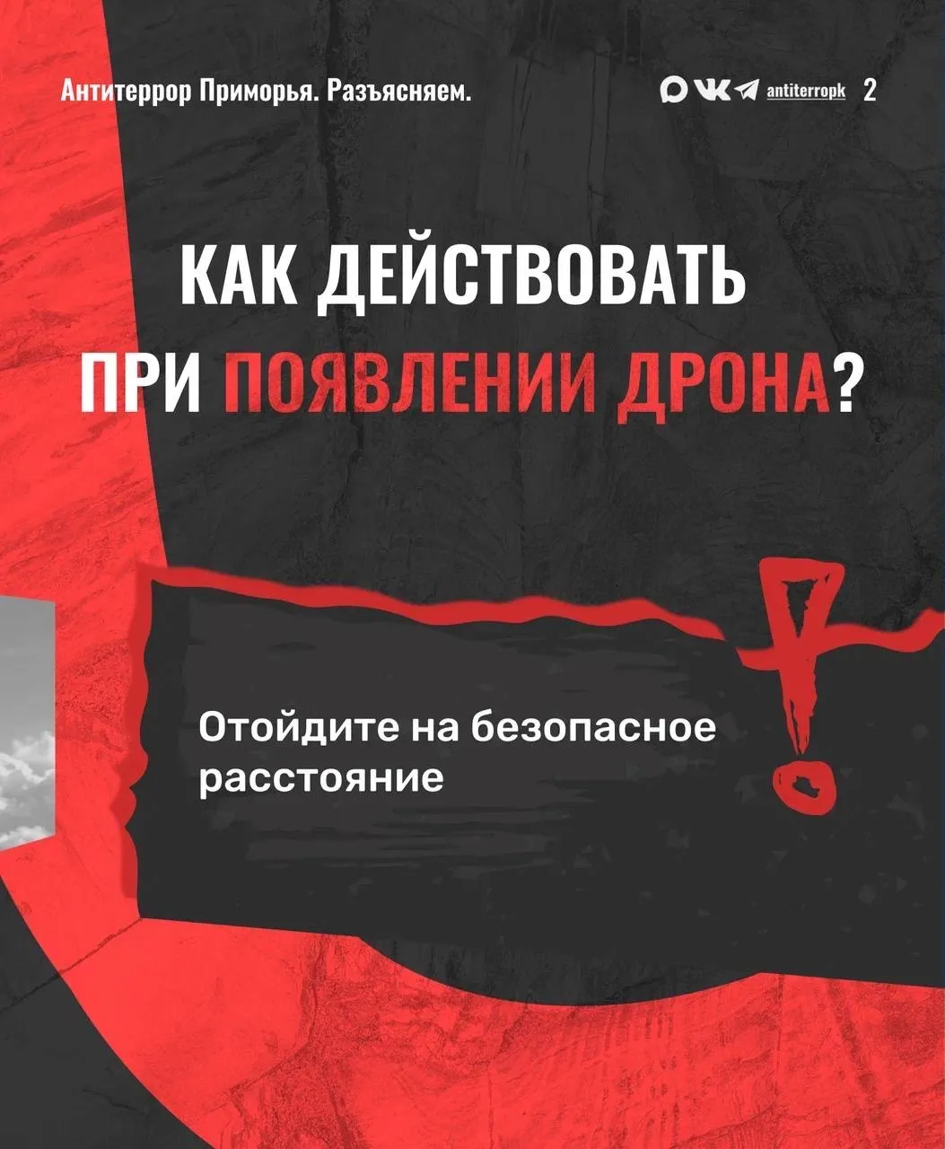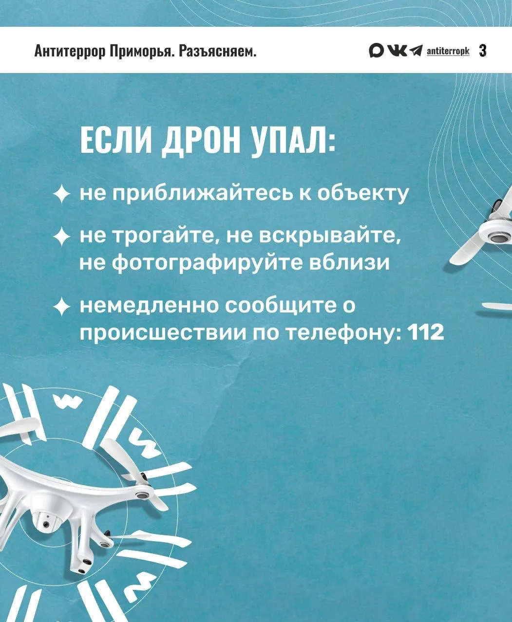 📌 Что делать и как себя вести, если видите в небе дрон - в карточках от Антитеррористической комиссии Приморского края.