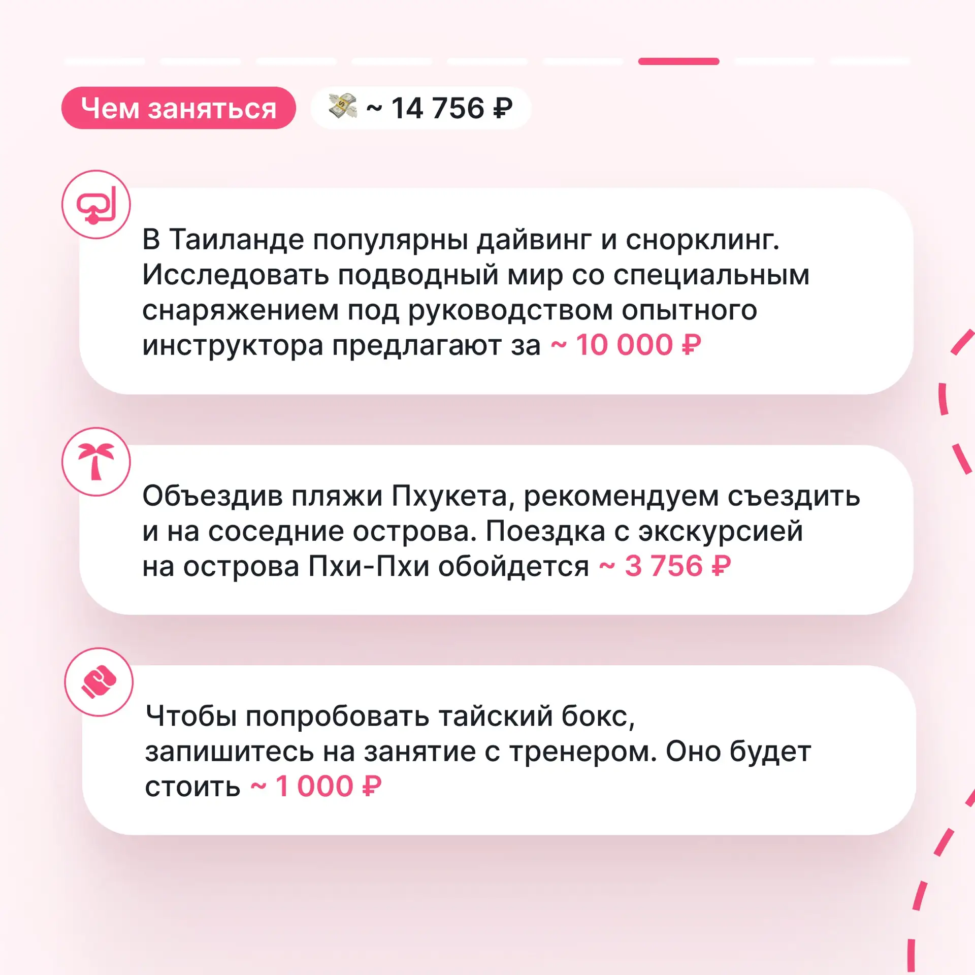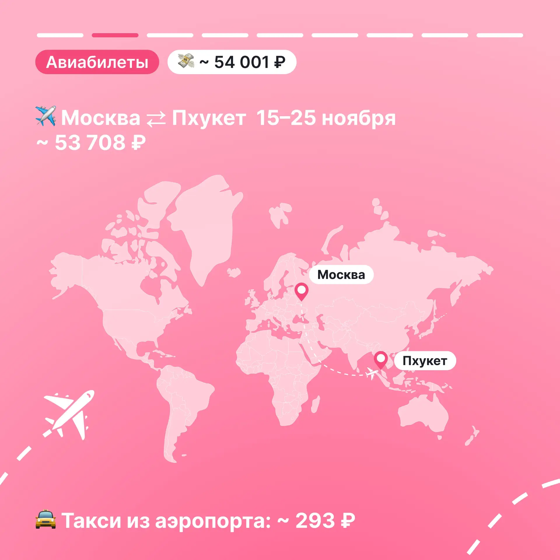 ✈️ Нашли авиабилеты из Москвы на Пхукет и обратно, подобрали отель 3*, узнали, куда стоит съездить и что попробовать на острове из еды. Всю информацию объединили для вас в карточках, а также посчитали примерную стоимость недельного путешествия.