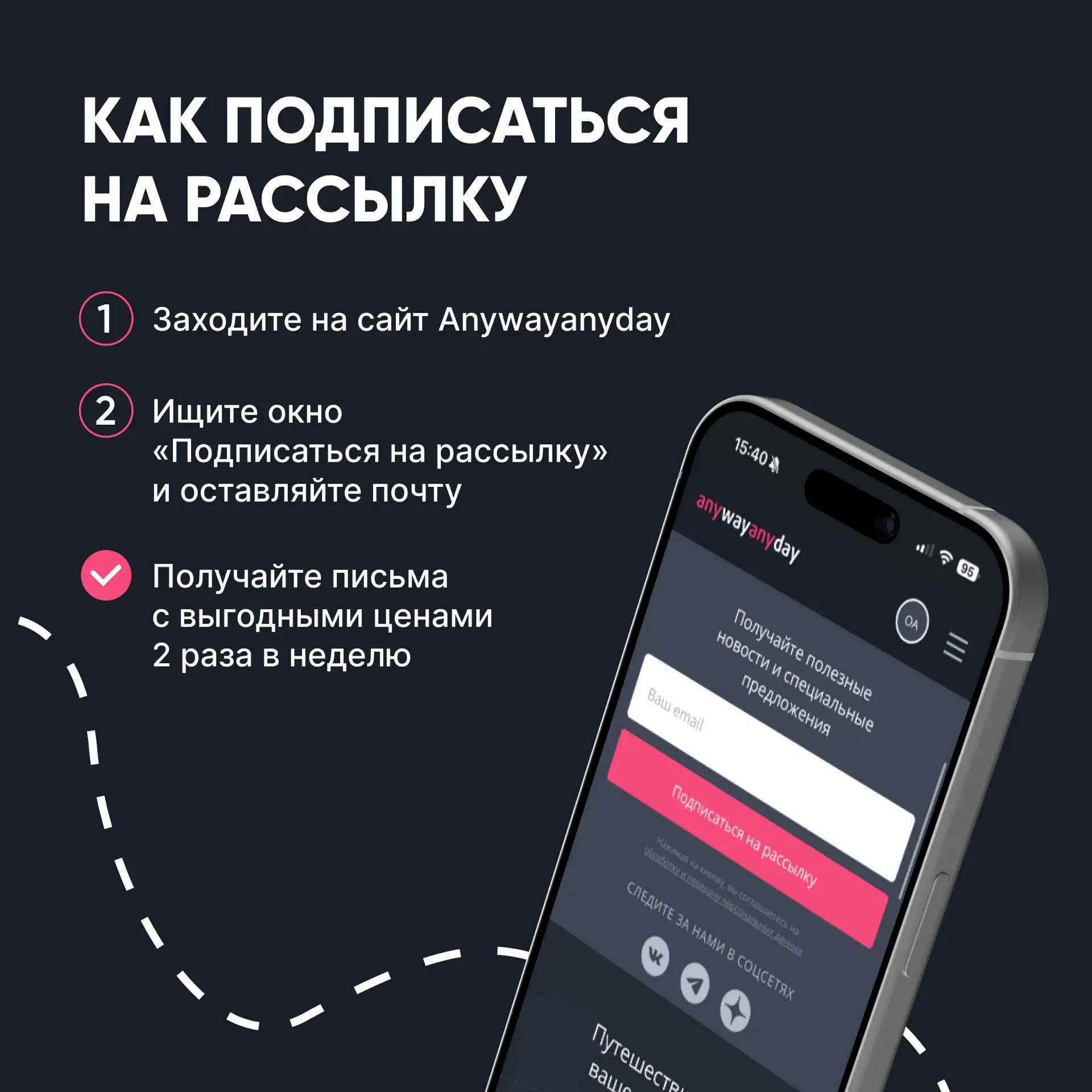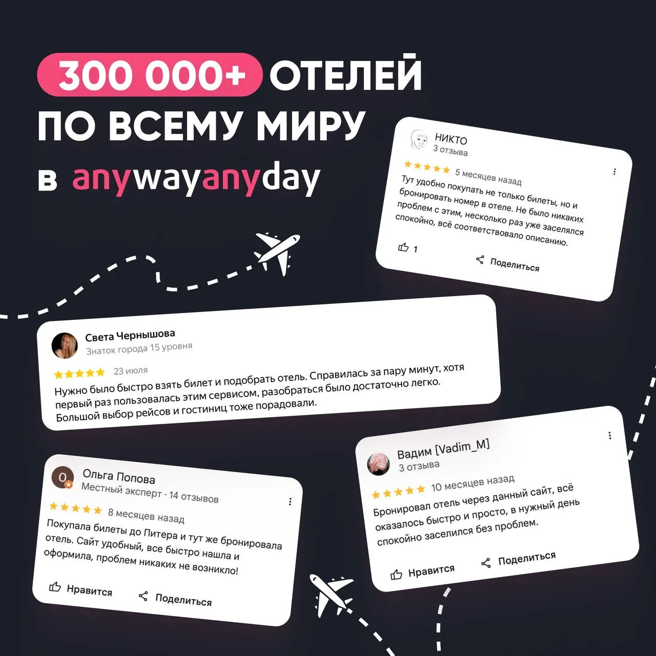 Привет! На связи Anywayanyday — простой и надежный тревел-сервис. Уже 17 лет мы дарим эмоции путешественникам и делаем мечту чуть ближе.