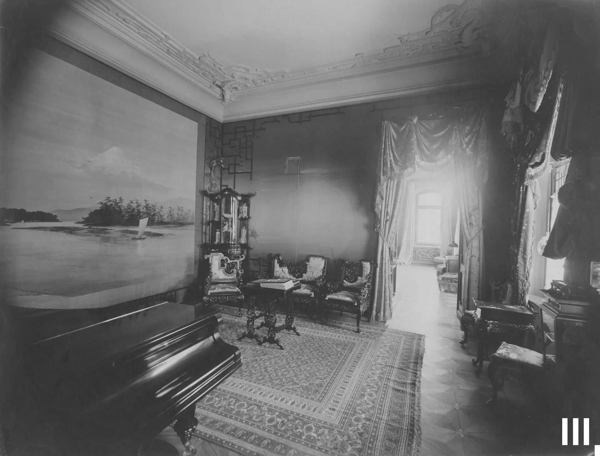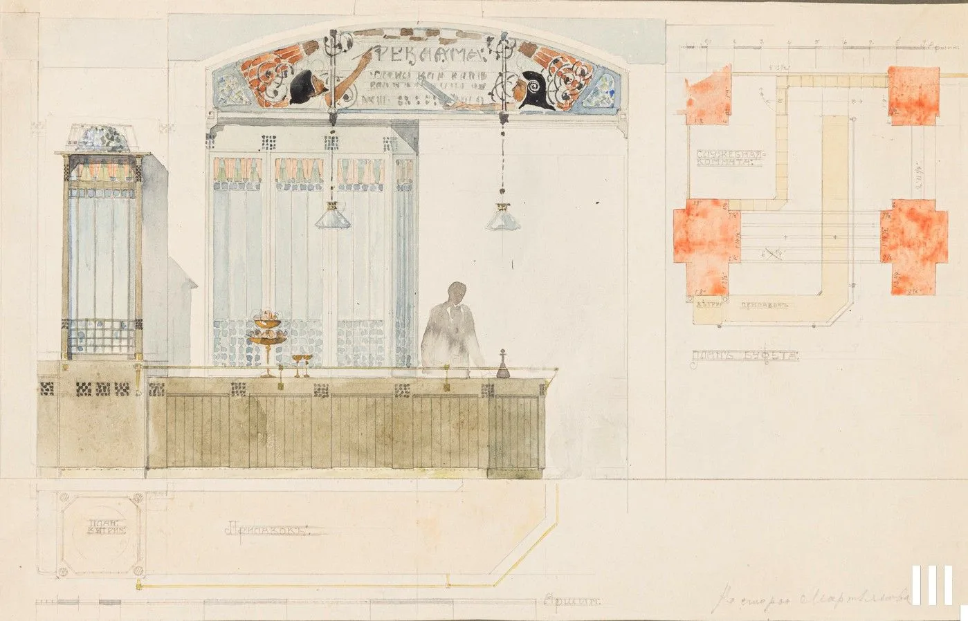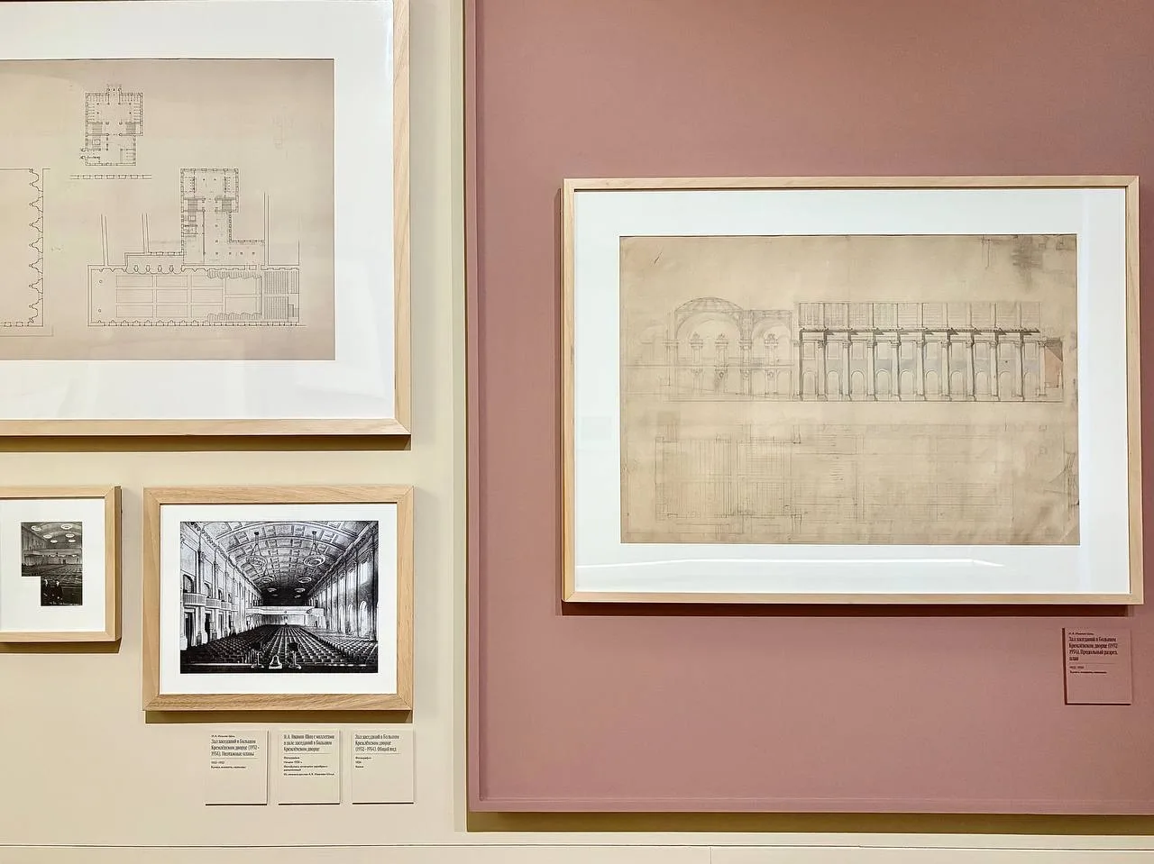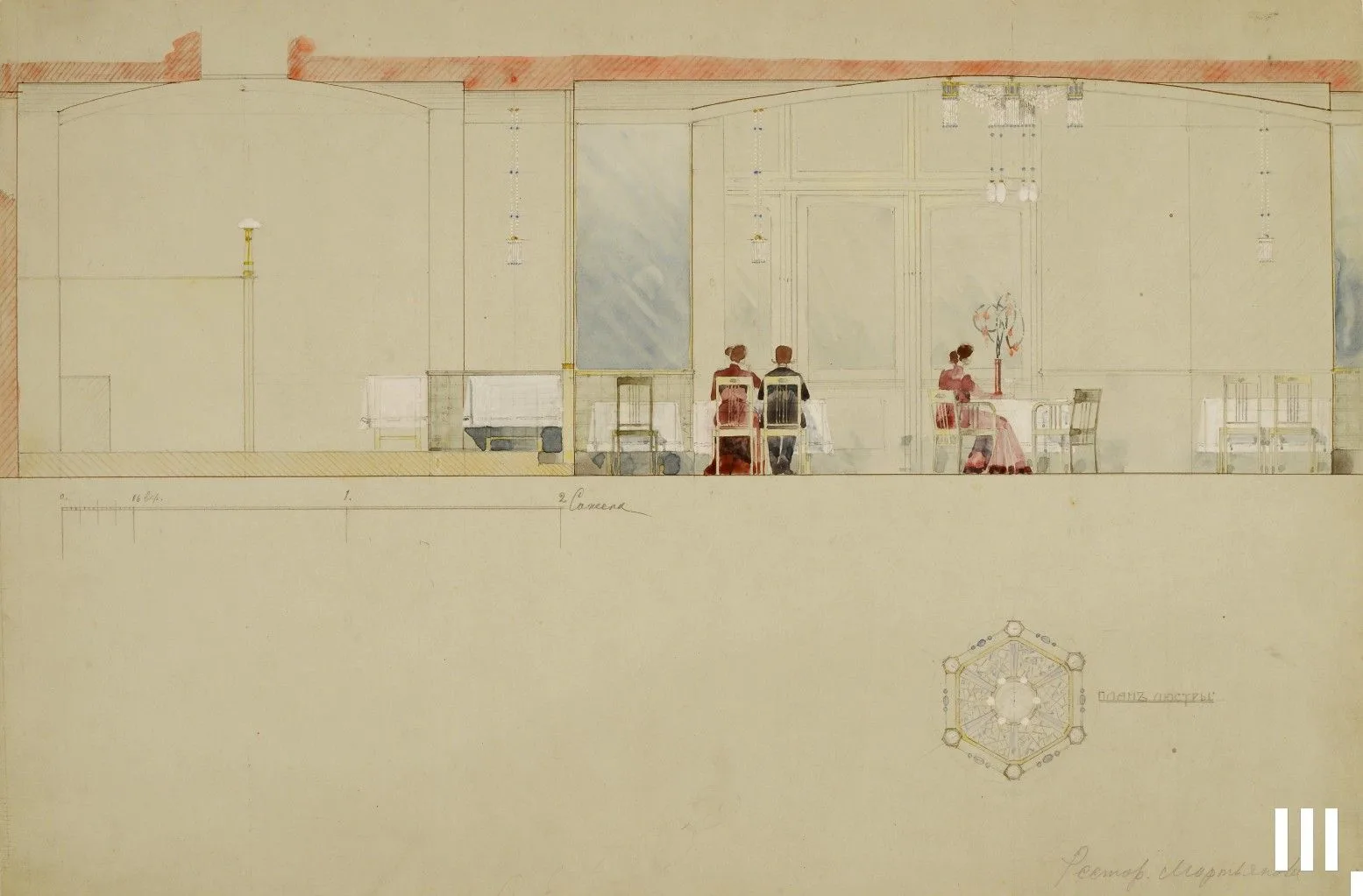 На выставке мы показываем один из сохранившихся ранних вариантов проекта перестройки парадных залов. Благодаря нему мы знаем, что Иванов-Шиц поначалу предлагал сохранить интерьеры Александровского зала и перестроить только Андреевский, а также сделать его двуцветным — пространство с колоннами должно было быть выкрашено в нежно-голубой цвет, а зона правее с трибуной и статуей Ленина покрашена в красновато-оранжевый.
