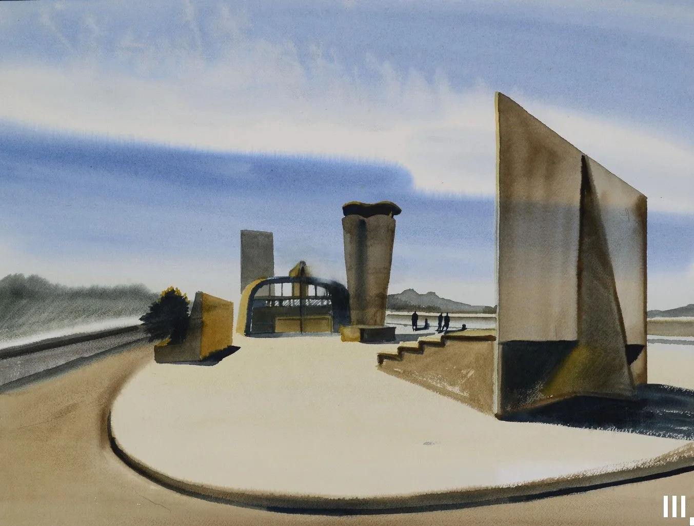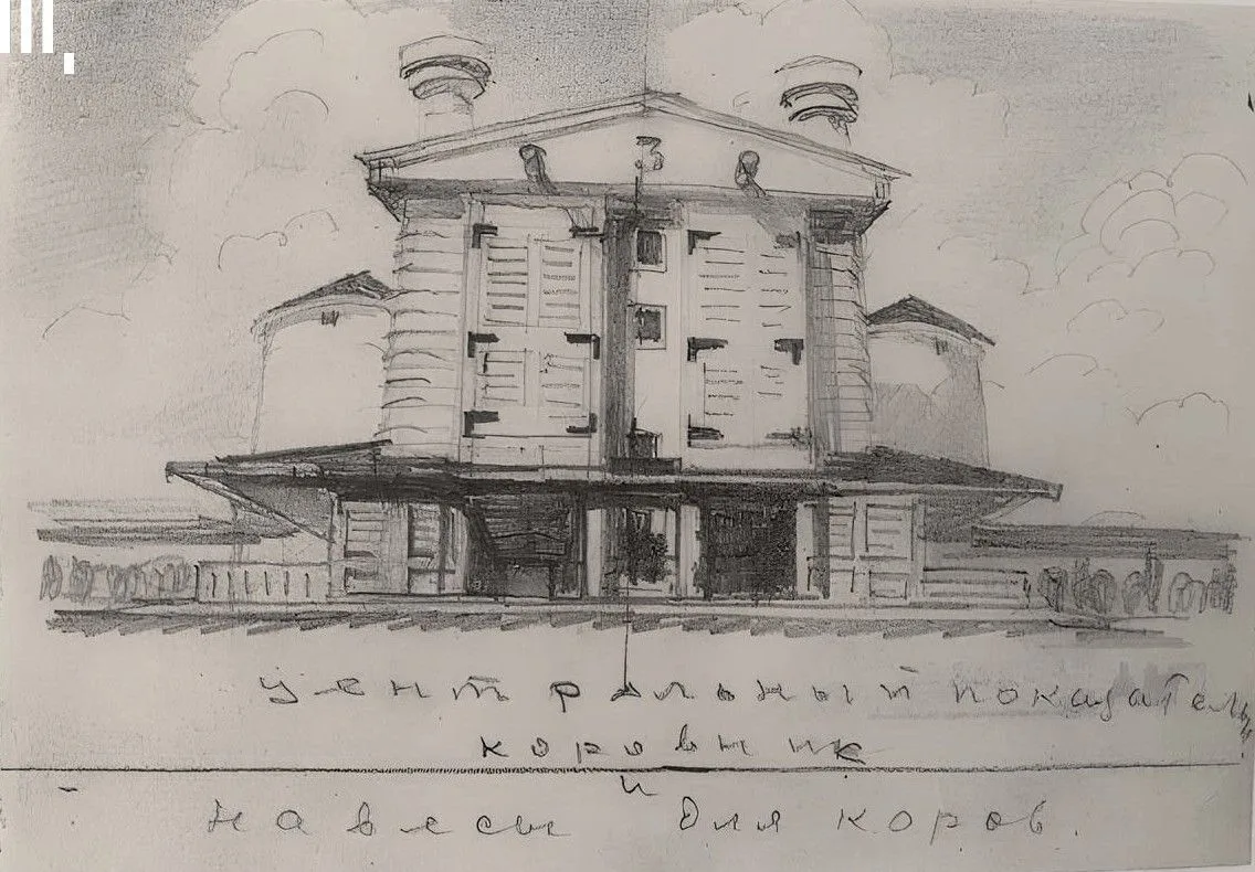 Вот и сегодня — эскиз Центрального показательного коровника на Выставке животноводства 1945 года. Проектировали его Юрий Щуко и Александр Хряков.