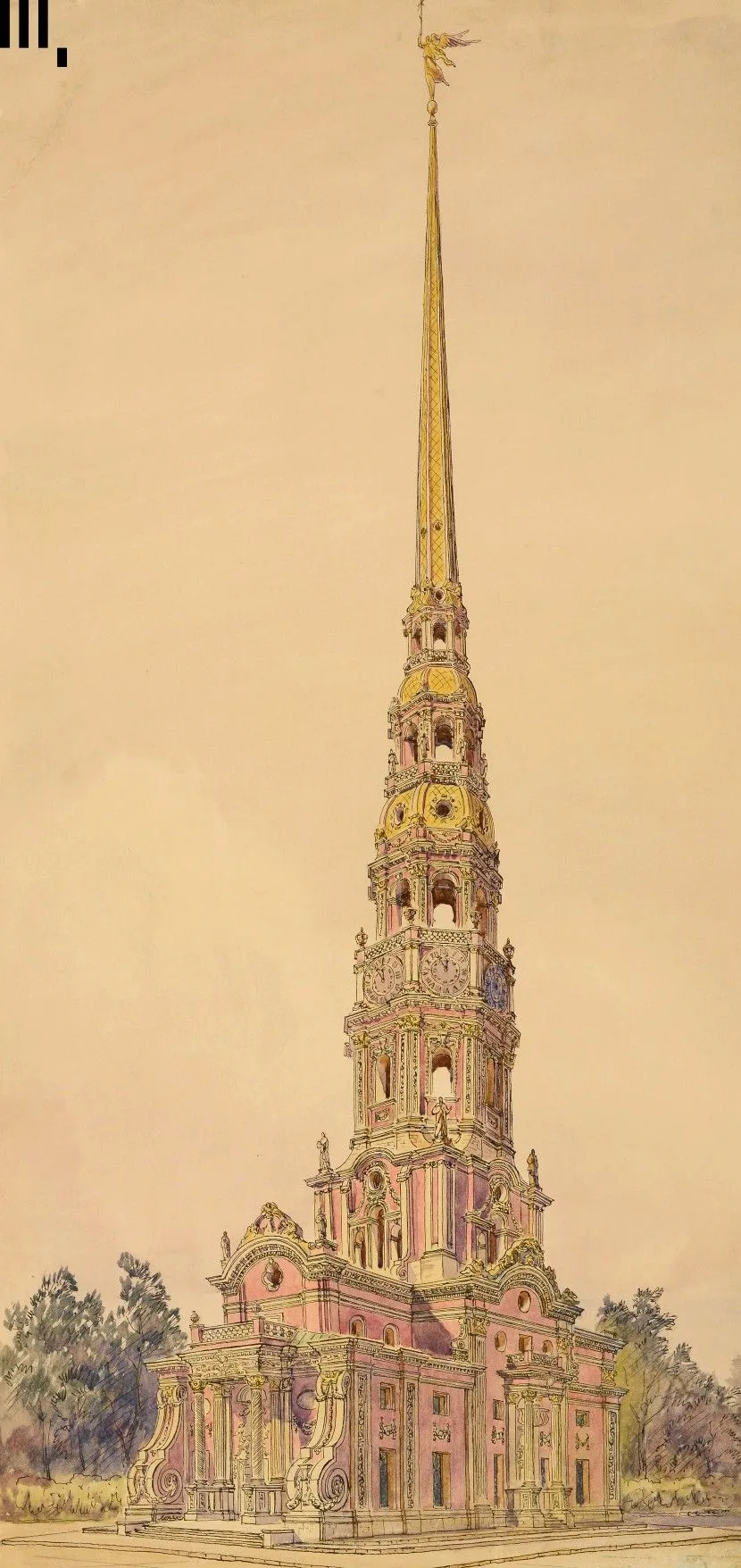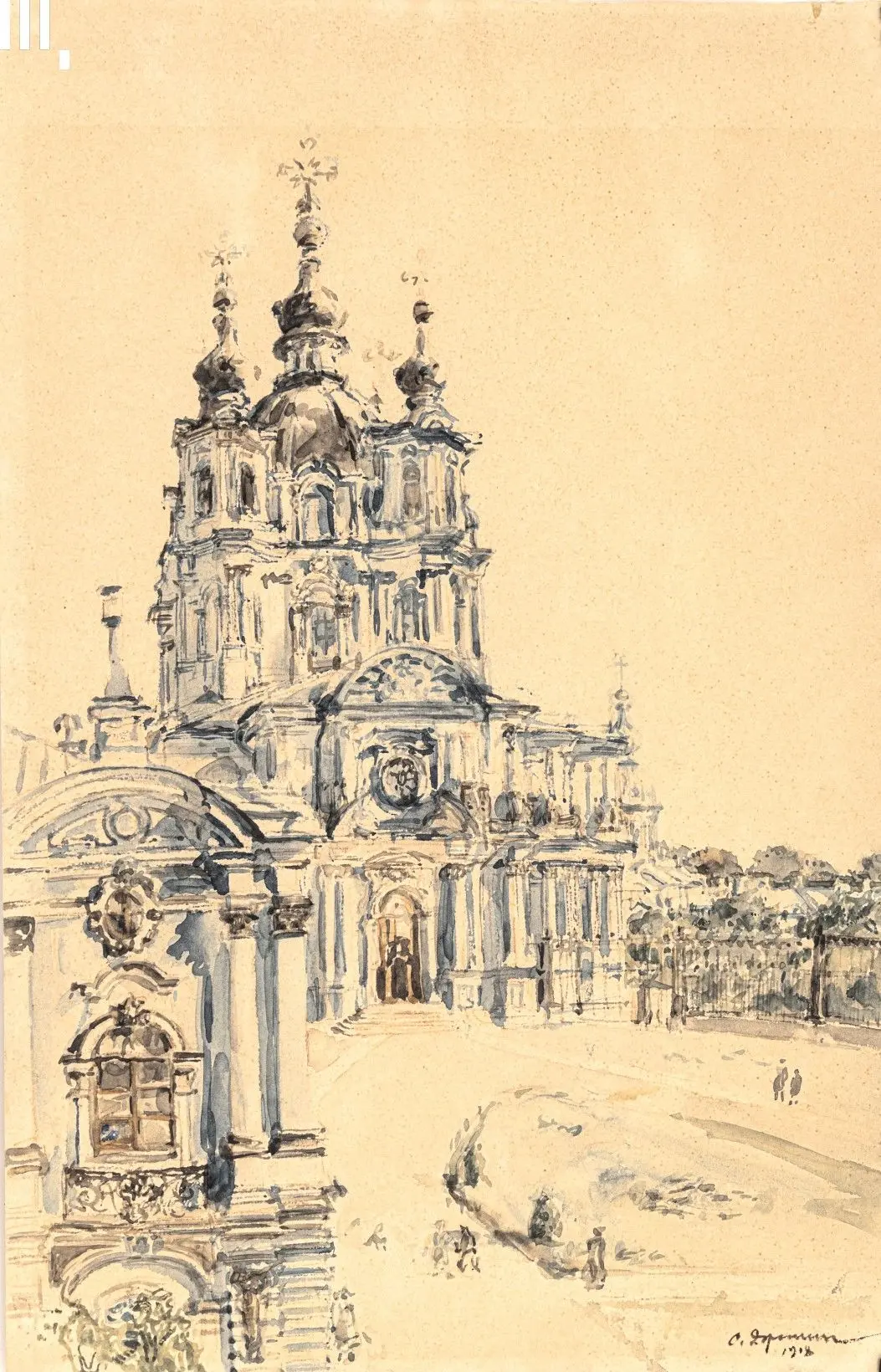 Полюбуйтесь, как точно красоту архитектуры барокко передает художник Степан Яремич! На его рисунке 1908 из #КоллекцияМУАР — Воскресенский собор Смольного монастыря в Петербурге.