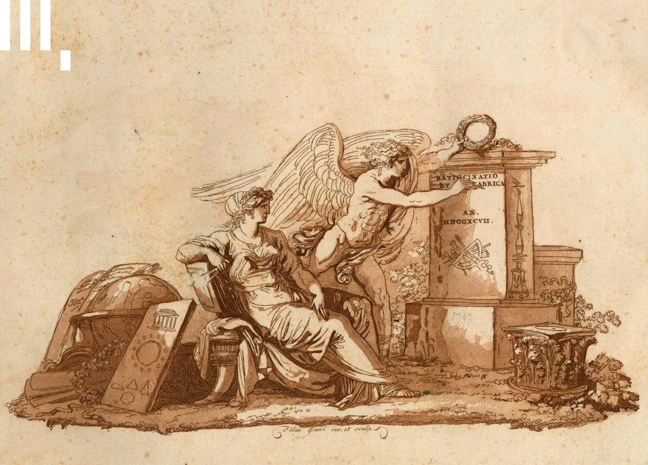 На листе изображена аллегорическая композиция, в центре которой — Афина, покровительница ремёсел, искусств и наук, богиня знаний и мудрости. Здесь её атрибуты — цикруль в руке, глобус и манускрипт, книги и архитектурный чертёж на планшете. Крылатый Гений вырезает на каменной стеле «RATIOCINATIO ET FABRICA», а замыкает композицию коринфская капитель.