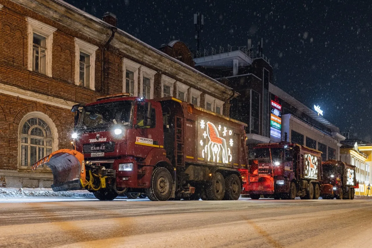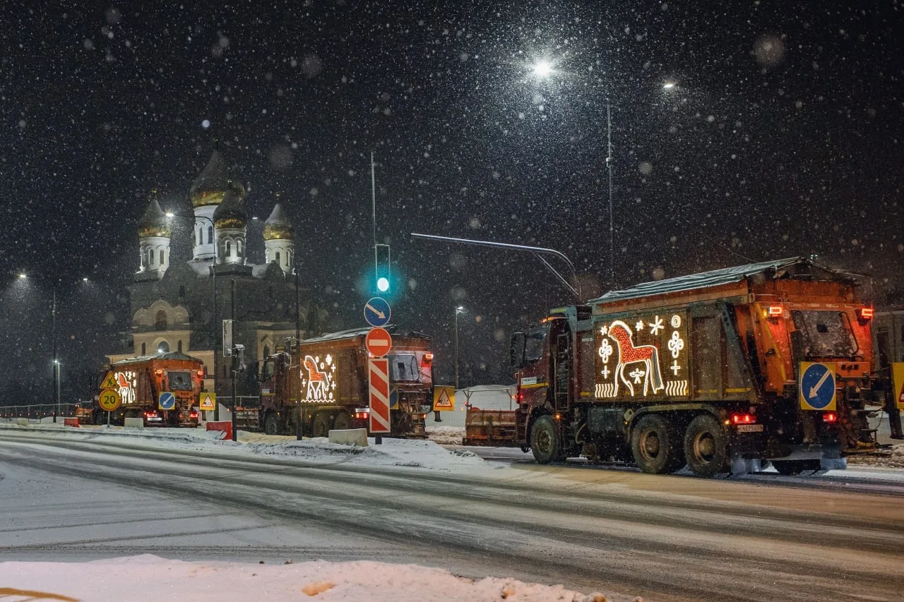 Дорожные службы Архангельска украсили спецмашины «мезенскими лошадками».